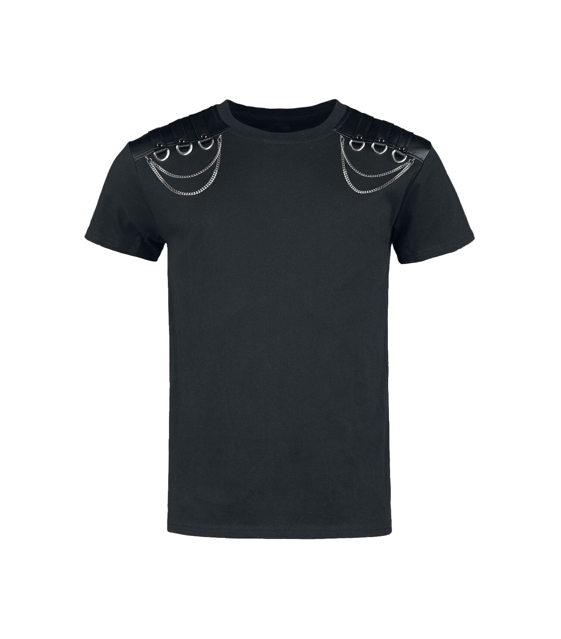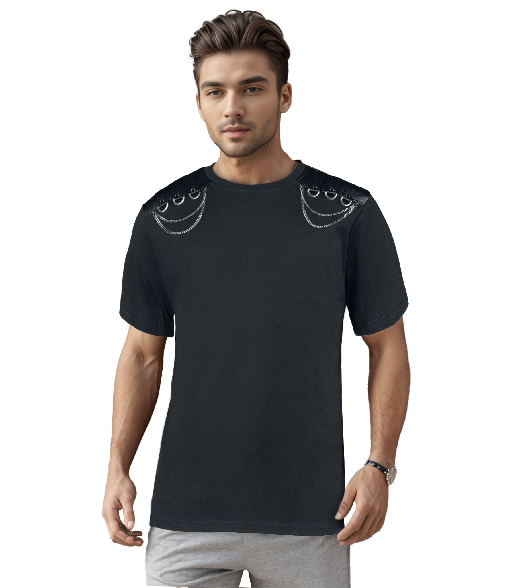 The Andras Style Raven Black T-Shirt is designed to blend contemporary Punk Rock, and goth style with ultimate comfort.This T-shirt features a sleek faux leather strip nhanced by striking faux leather details on the shoulders. Crafted from high-quality Hosiery fabric, renowned for its durability, ensuring all-day comfort.At Wholesale Next We offer customization options for fabric, color, and design to meet your specific retail needs.