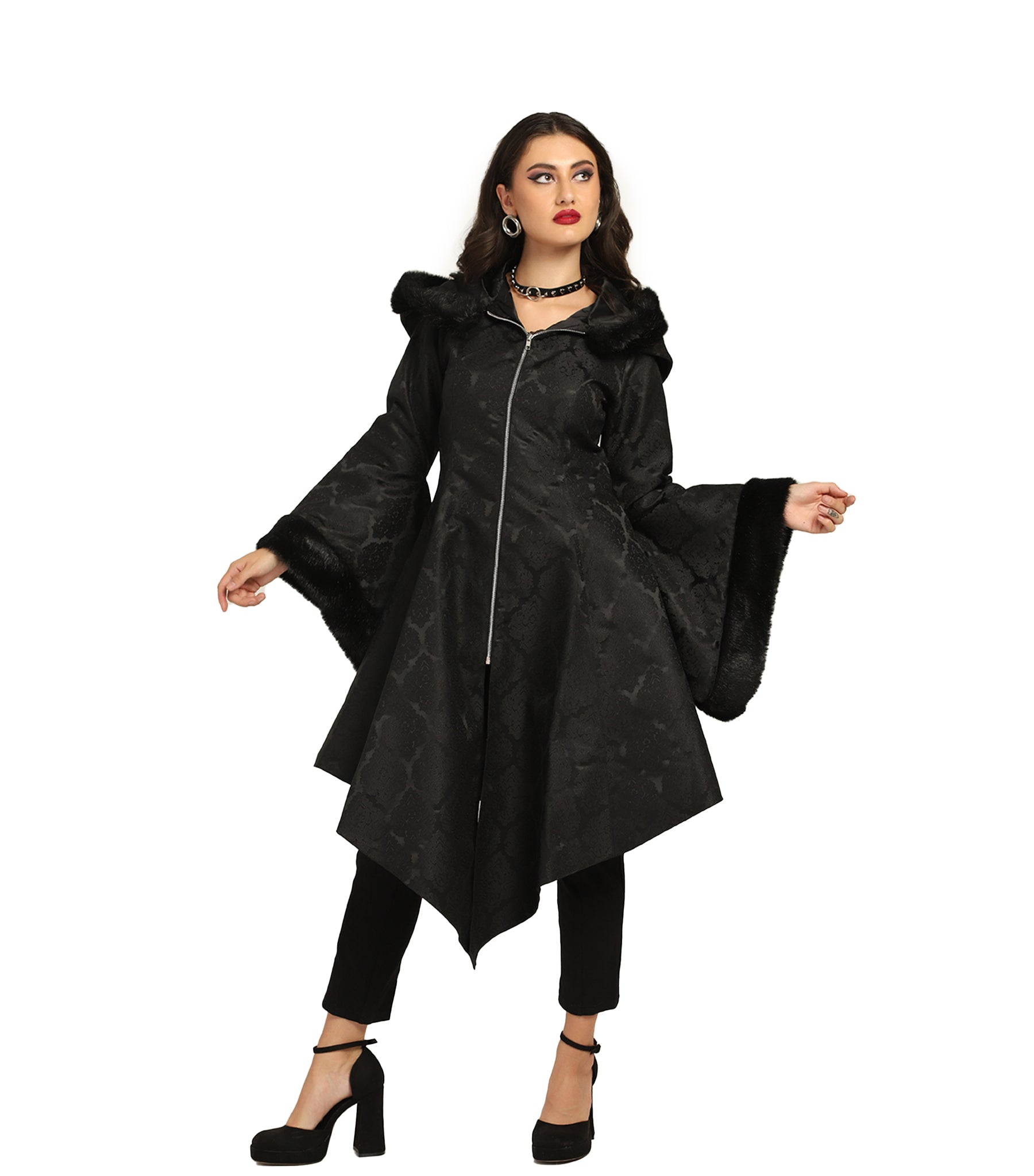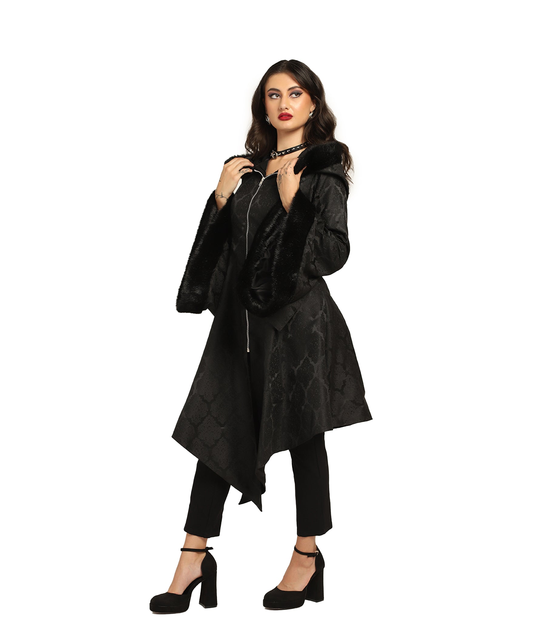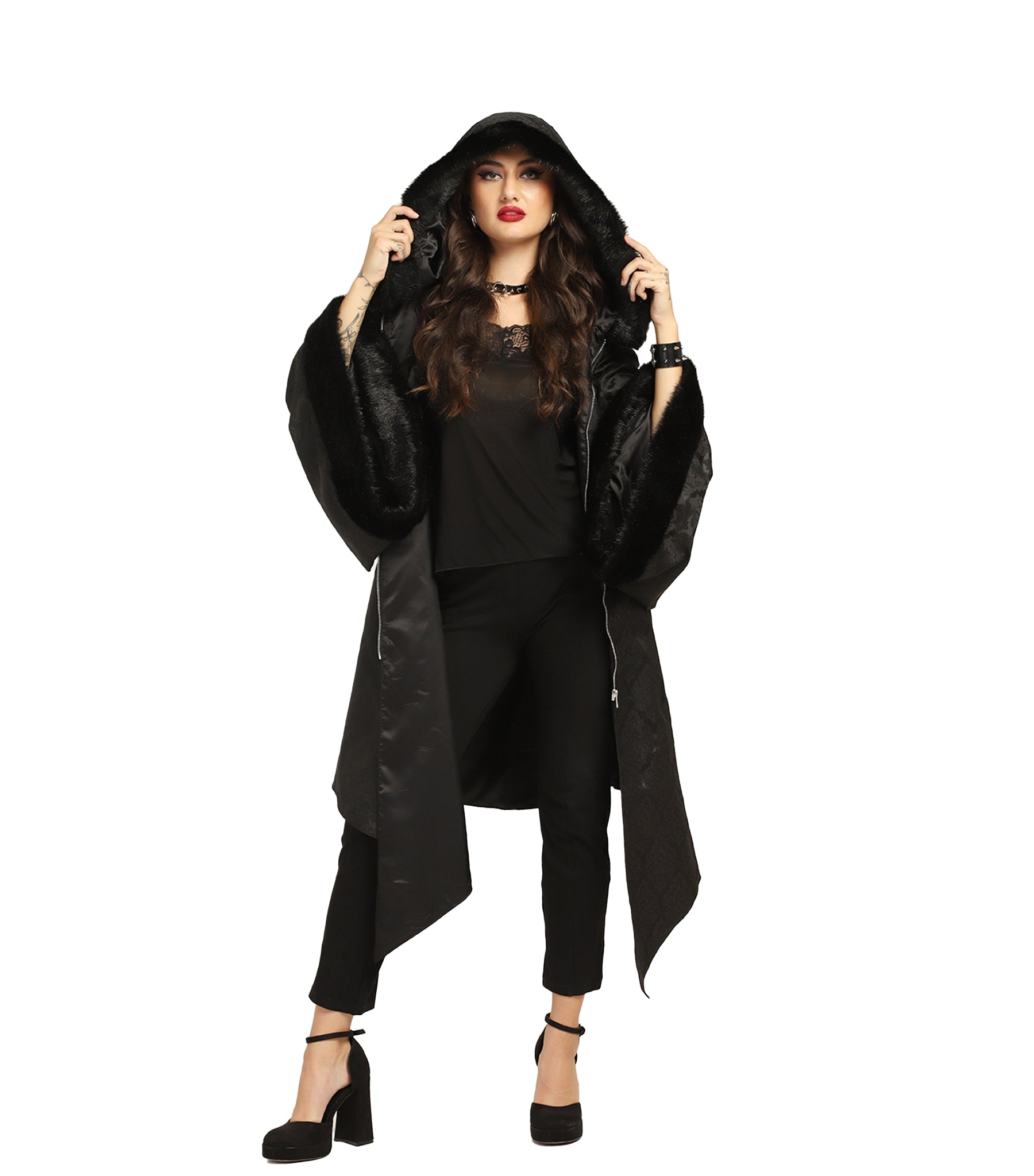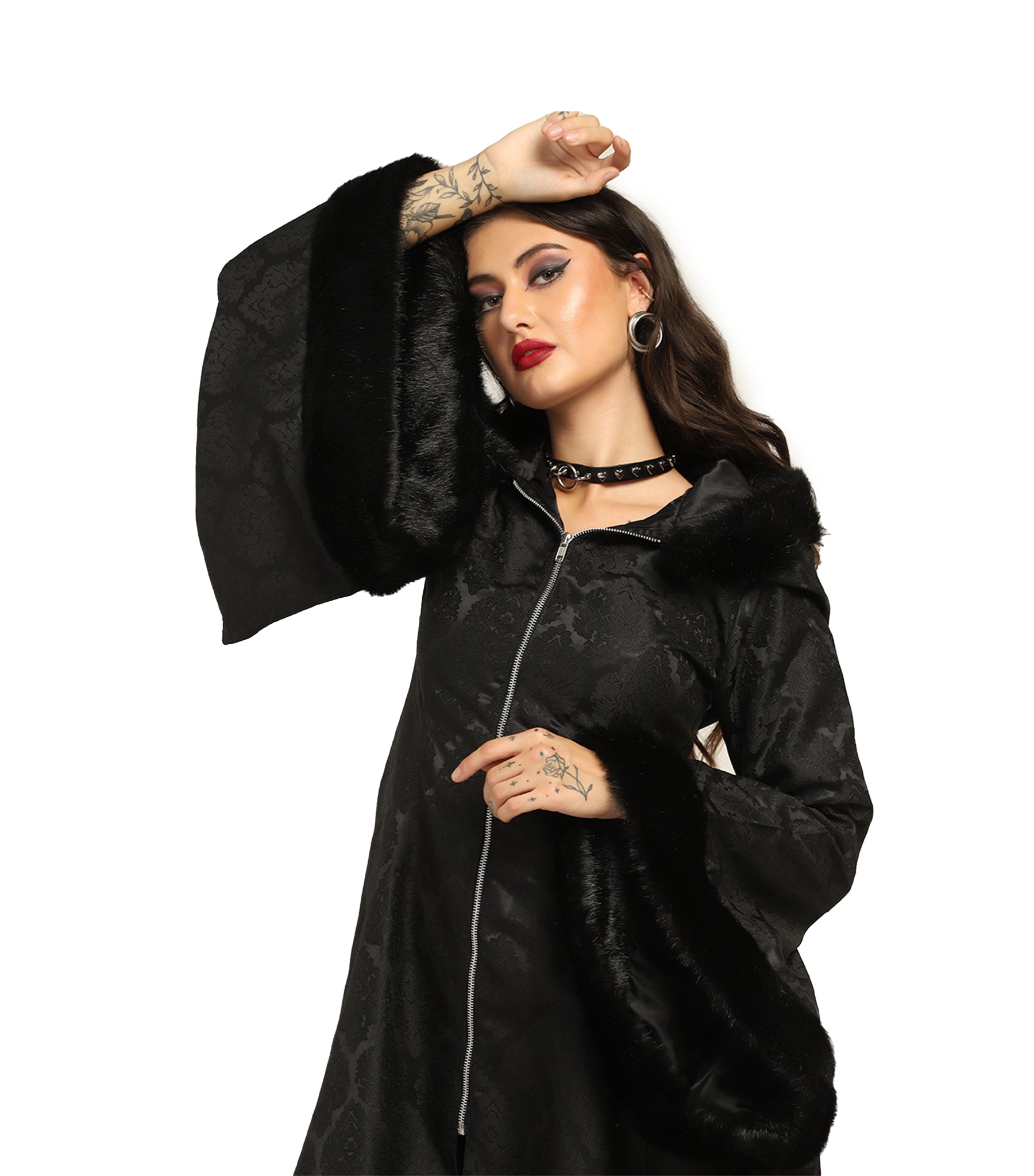 Black Brocade Long Coat with Fur-Trimmed Sleeves and Hood – Wholesale