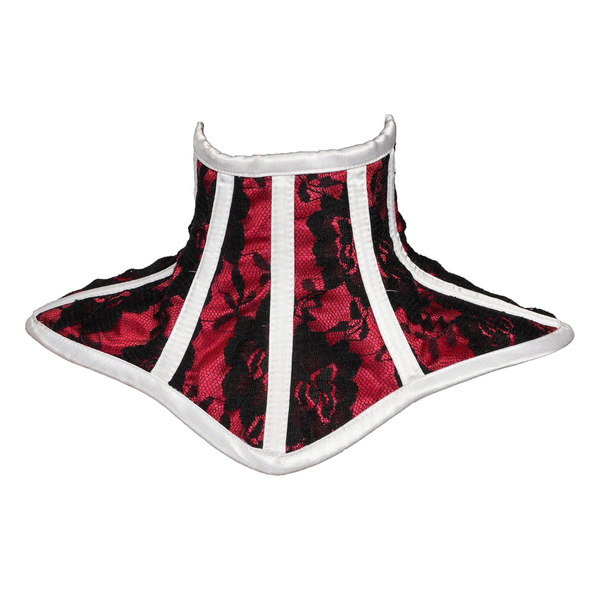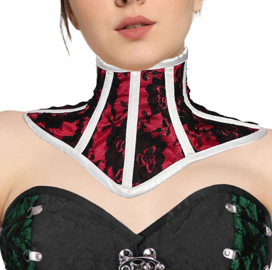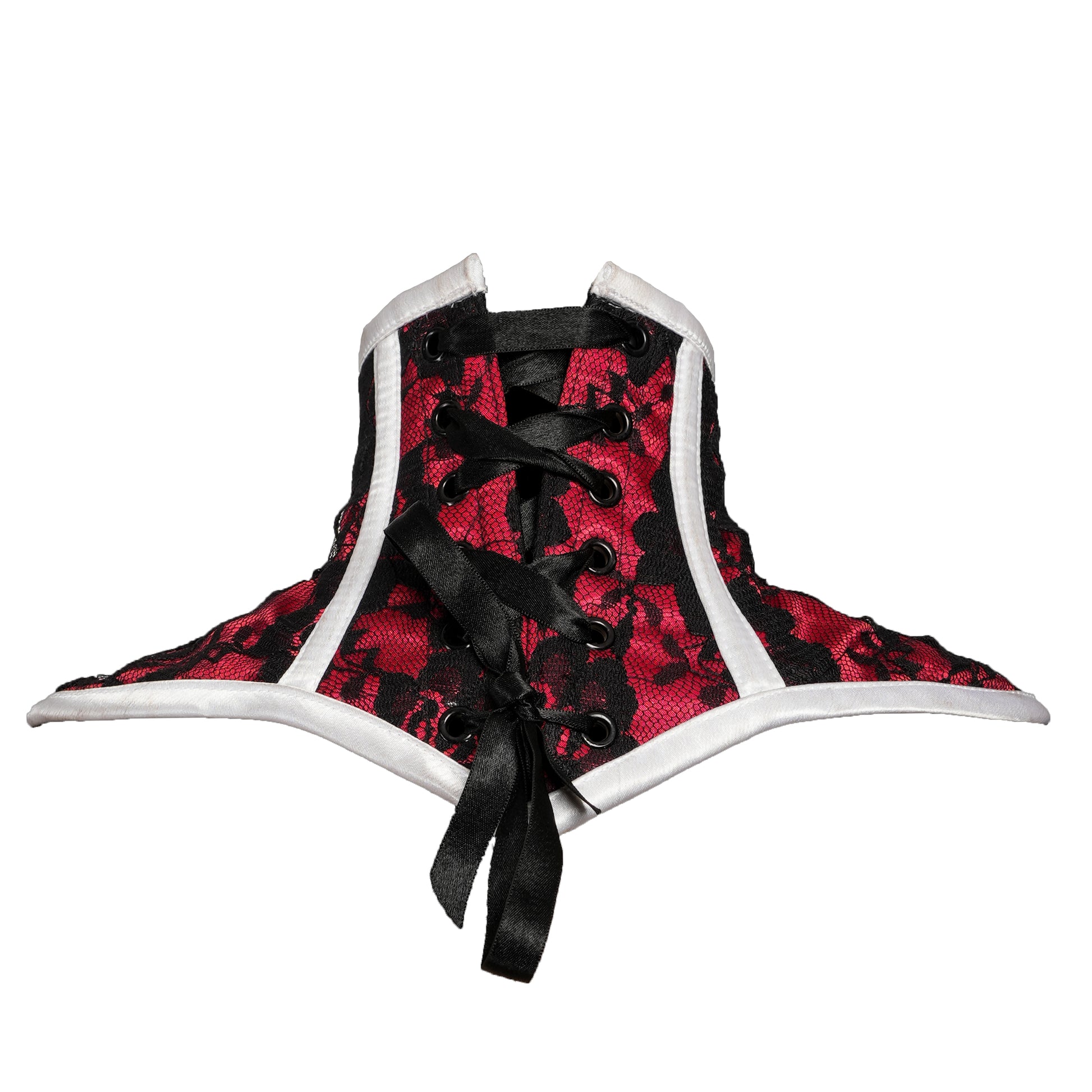 The High Collar Neck Band adorned with intricate black floral mesh over luxurious red satin, featuring a standout accessory.The high collar design enhances the neckline, while the lace-up back ensures a customizable fit and adds a touch of Victorian-inspired charm.