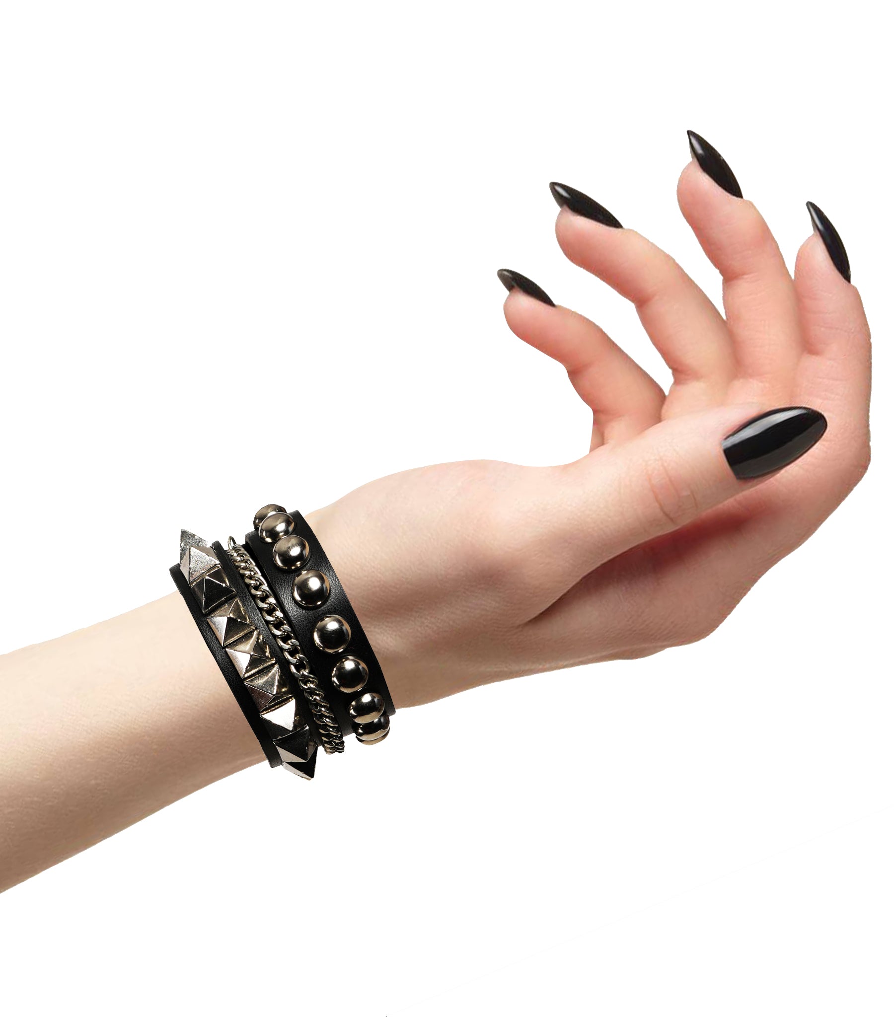 - Get the ultimate punk look with our Black Leather Bracelet. Featuring triple layers of chains, rivets, and studs, it's designed to stand out. Crafted from sturdy leather, it's tough yet stylish. Adjust the closure for a perfect fit. Perfect for concerts or casual hangs, it adds a rebellious edge to any outfit.