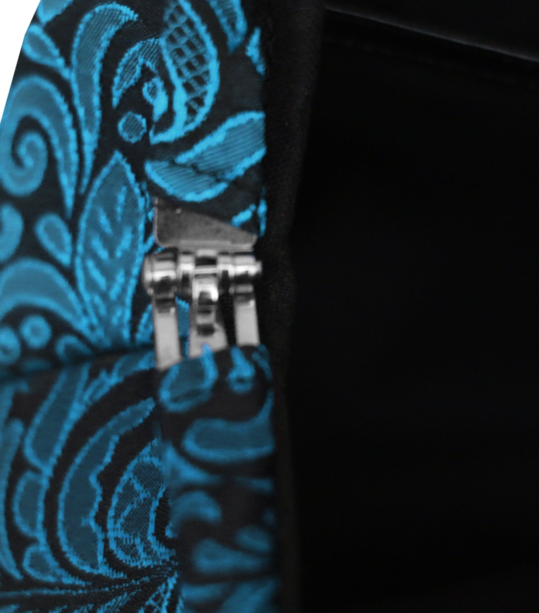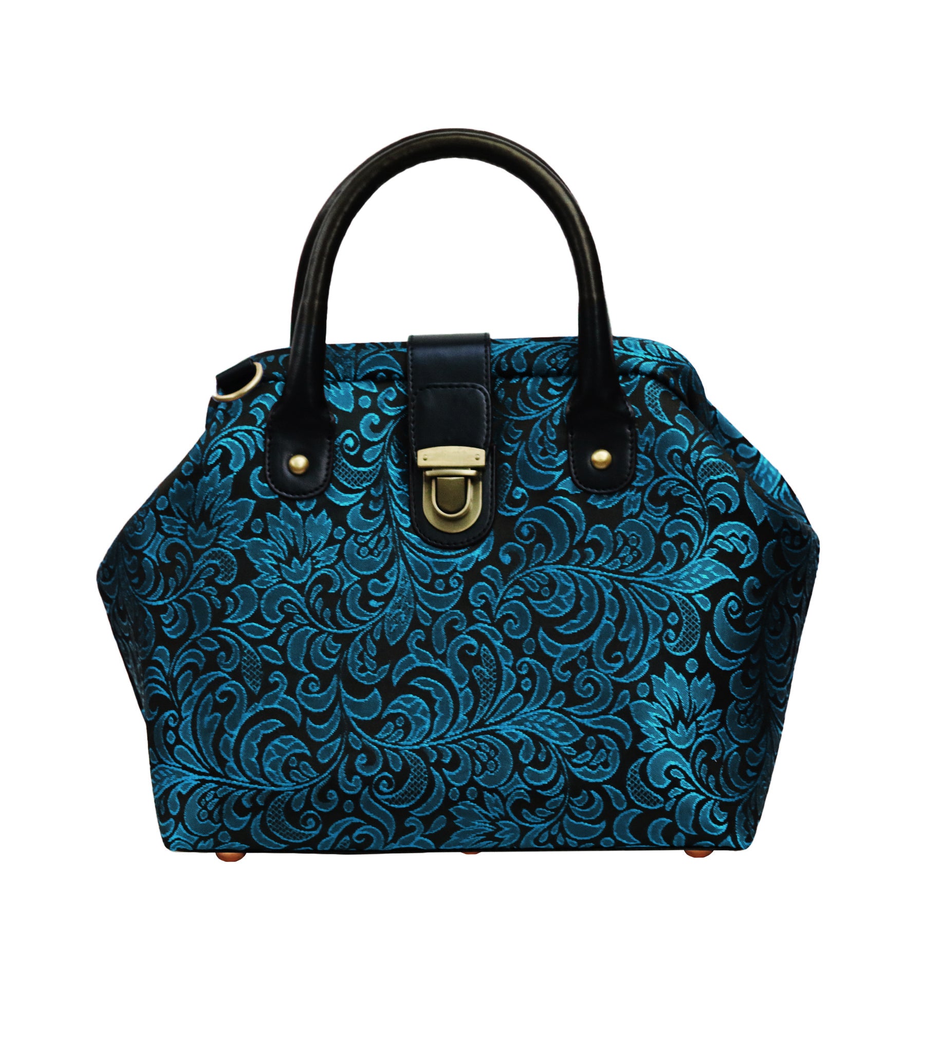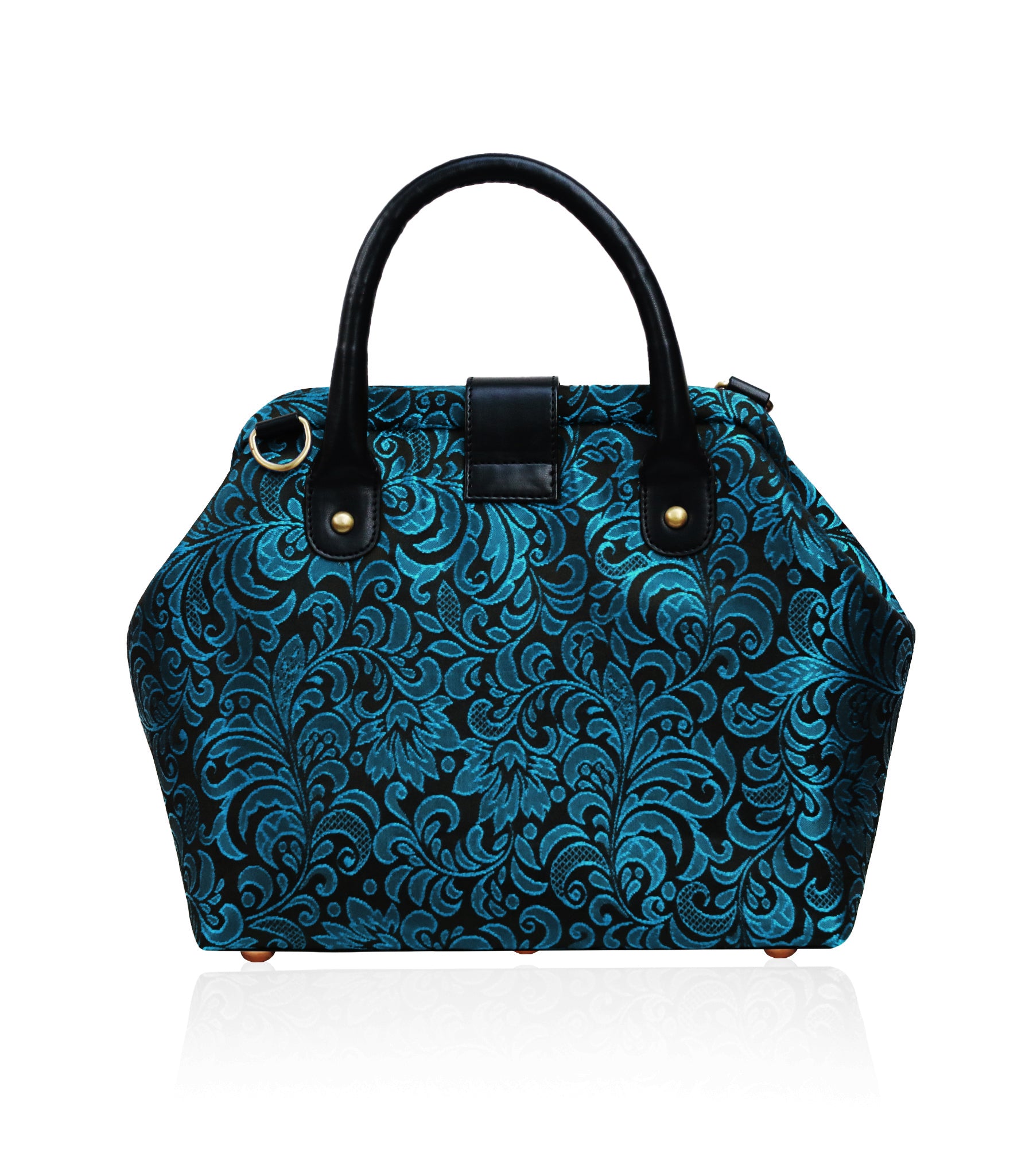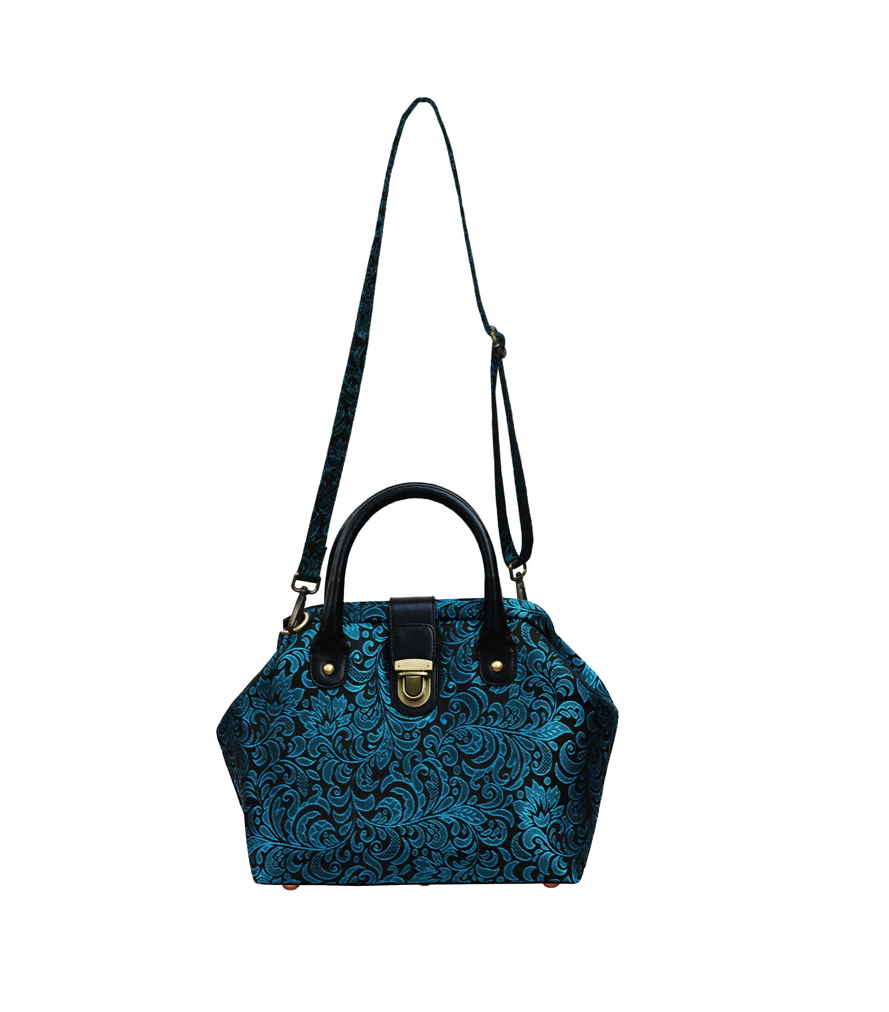 This Turquoise Brocade Pentagon Shaped Handbag With Sling/crossbody Strap. The handles are made of faux leather. There are 5 bronze studs at the bottom. Every purse comes with a detachable and adjustable shoulder strap 23” in length. The strap is made from the same Brocade as the bag, and fixed with high quality bronze hookers on the two ends.