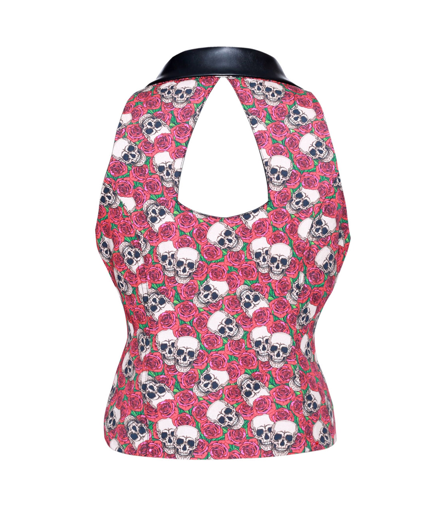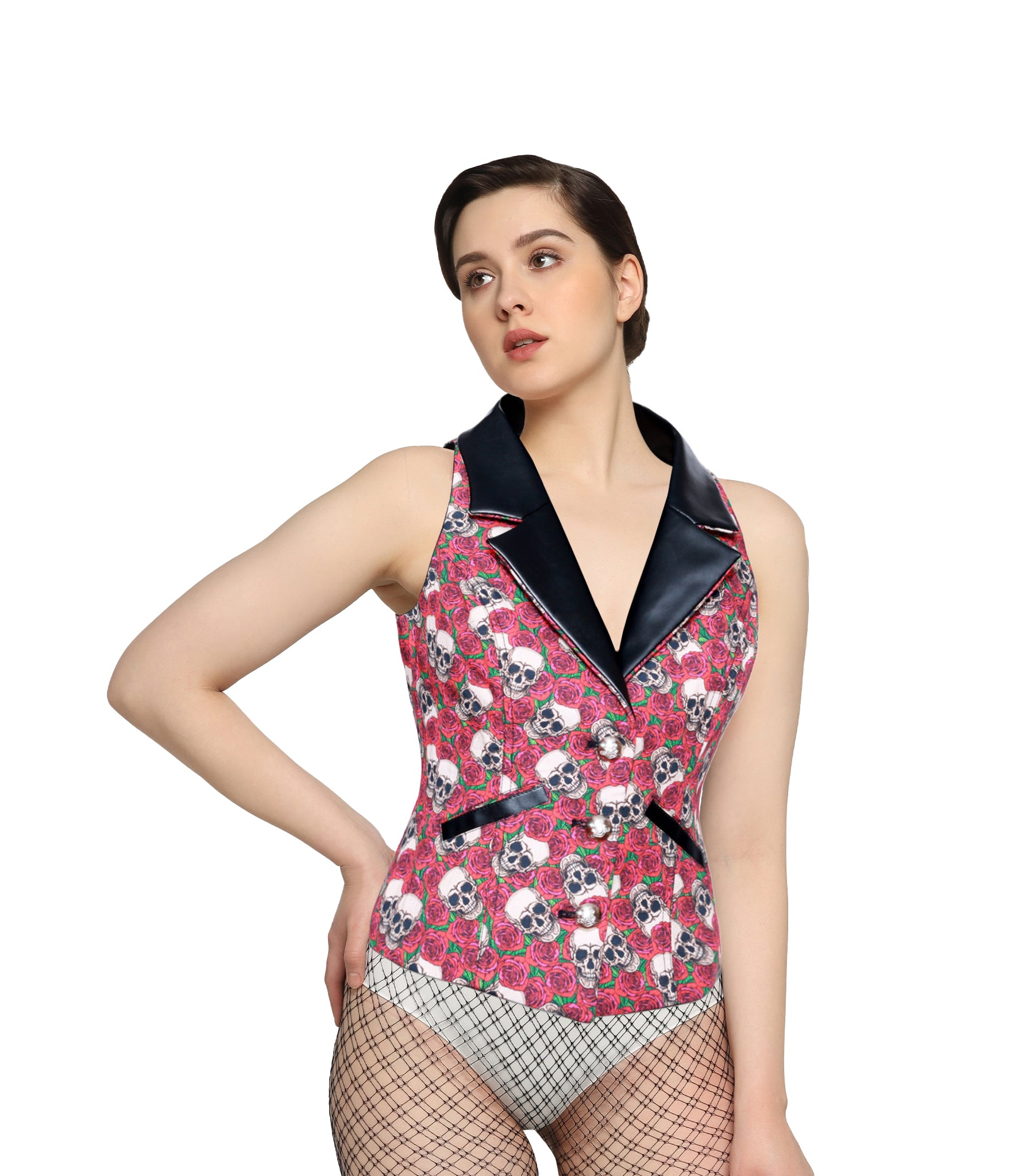 Camille Rose Skull Printed Fabric Ladies Notch Collar Waistcoat