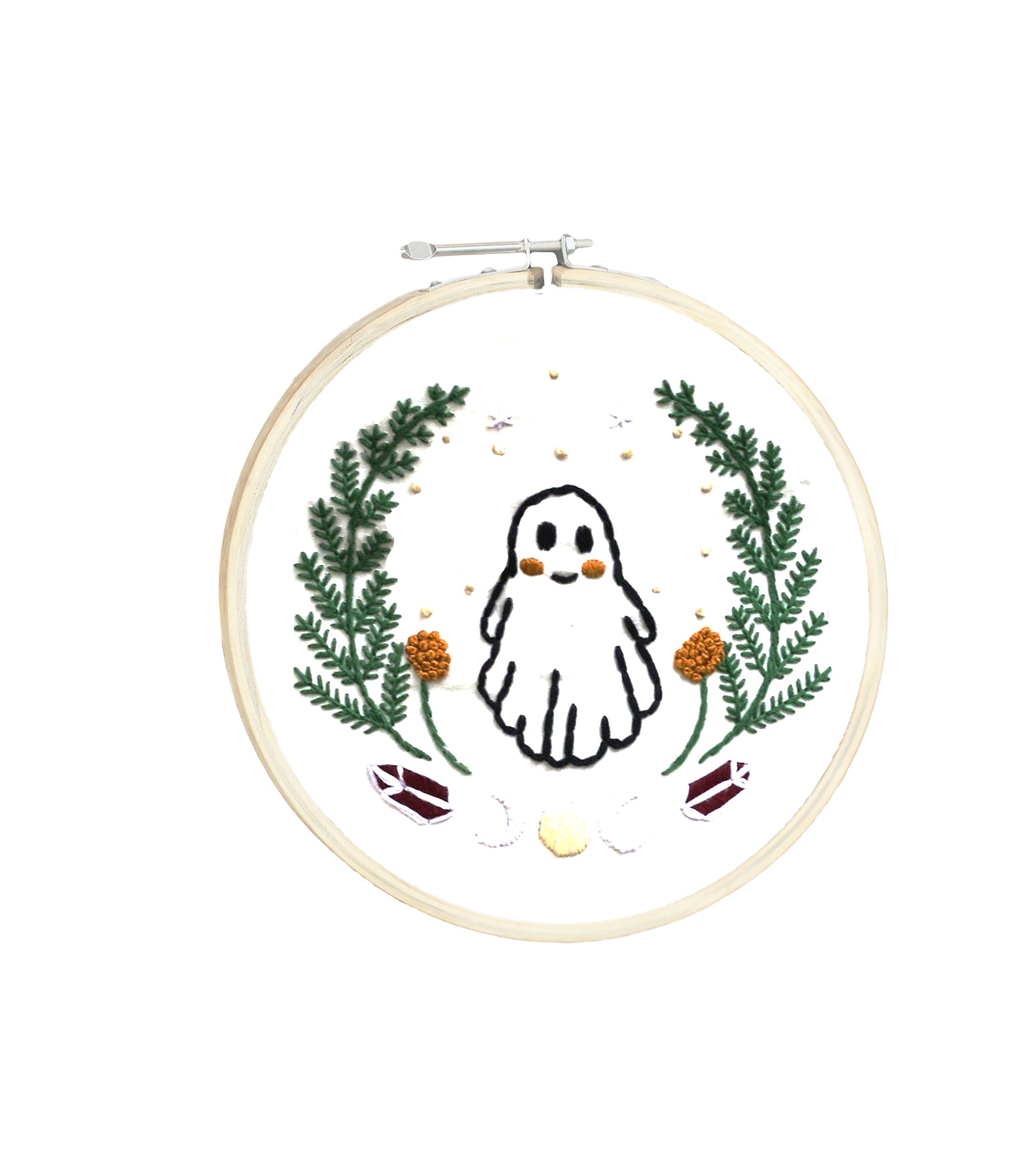 Artistry in Stitches: Contemporary Ghost hand embroidery hoop for wall decor.