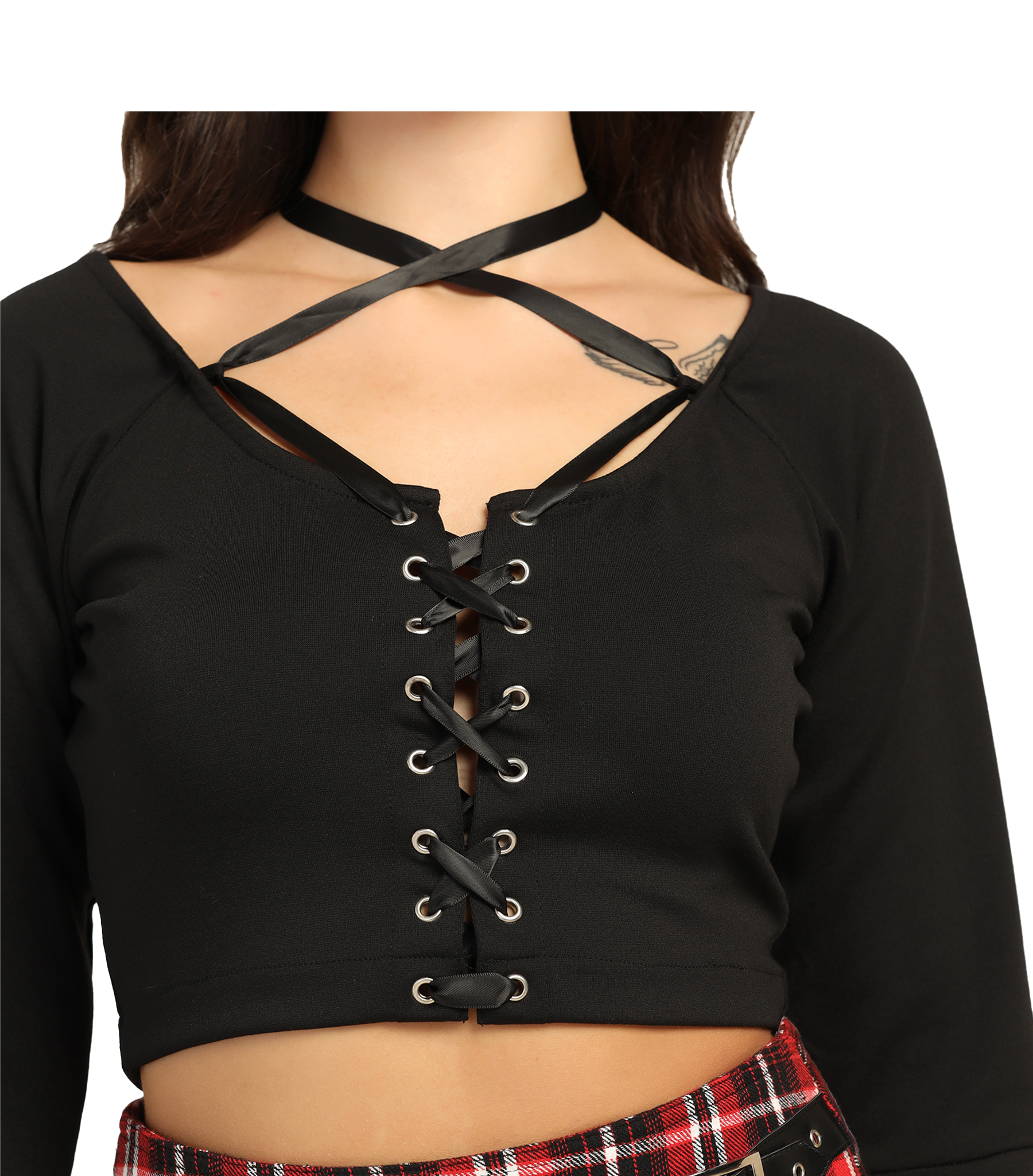 The Versatile Crisscross Lace-Up Top is made from 100% polyester scuba fabric. The adjustable satin lace can be tied in various creative ways, providing the freedom to shape the neckline. It features long, flared sleeves for added style.