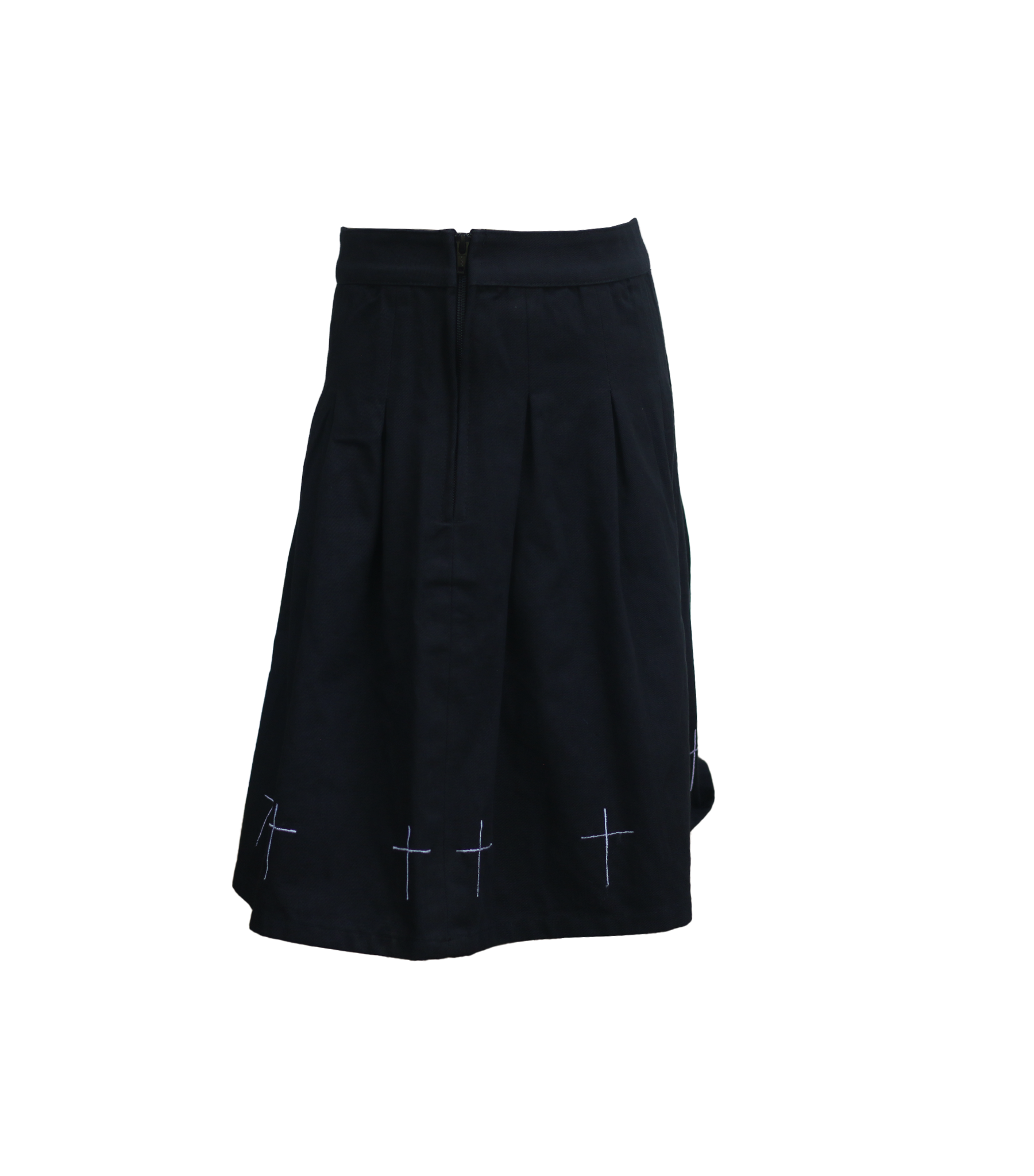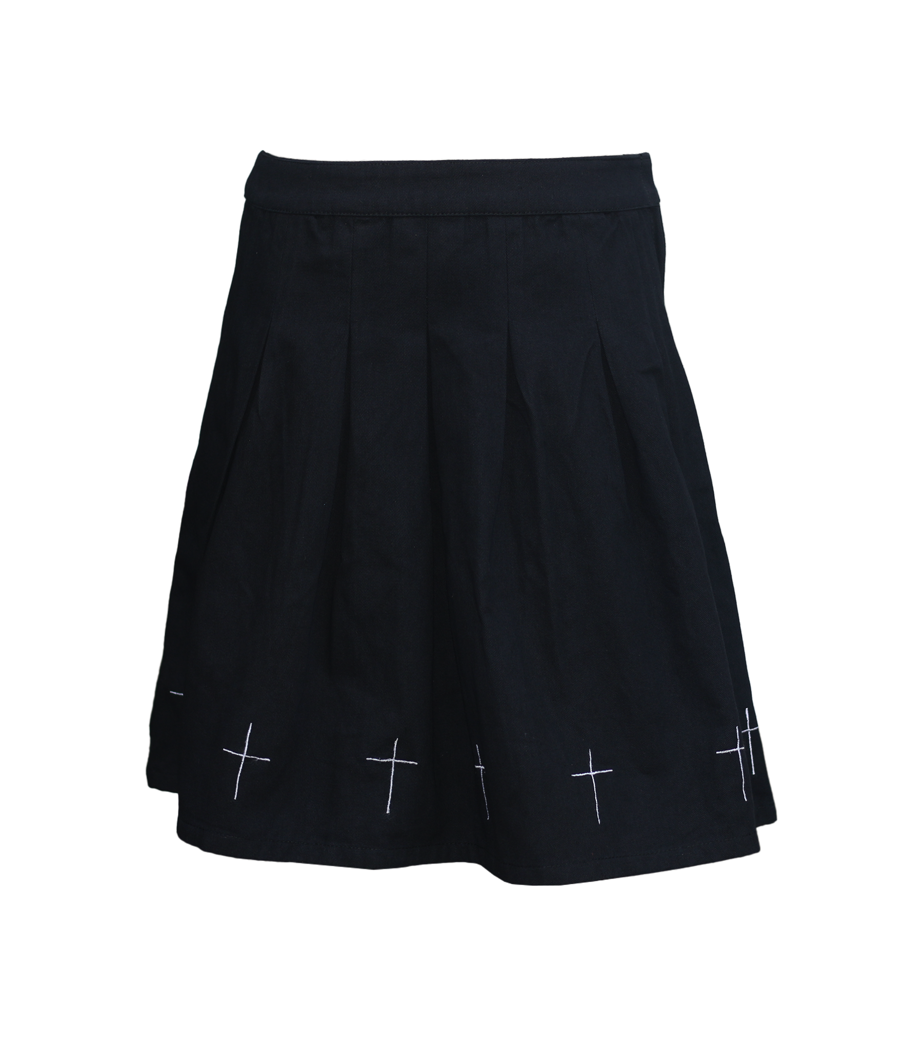 - Design: High waist, pleated, and adorned with a Gothic cross pattern.