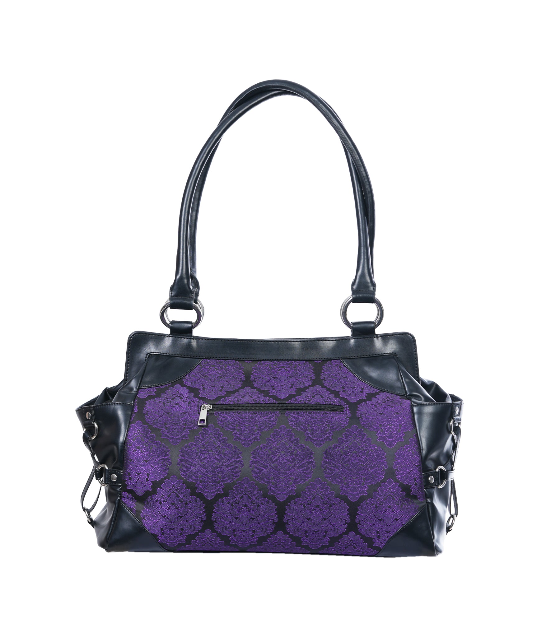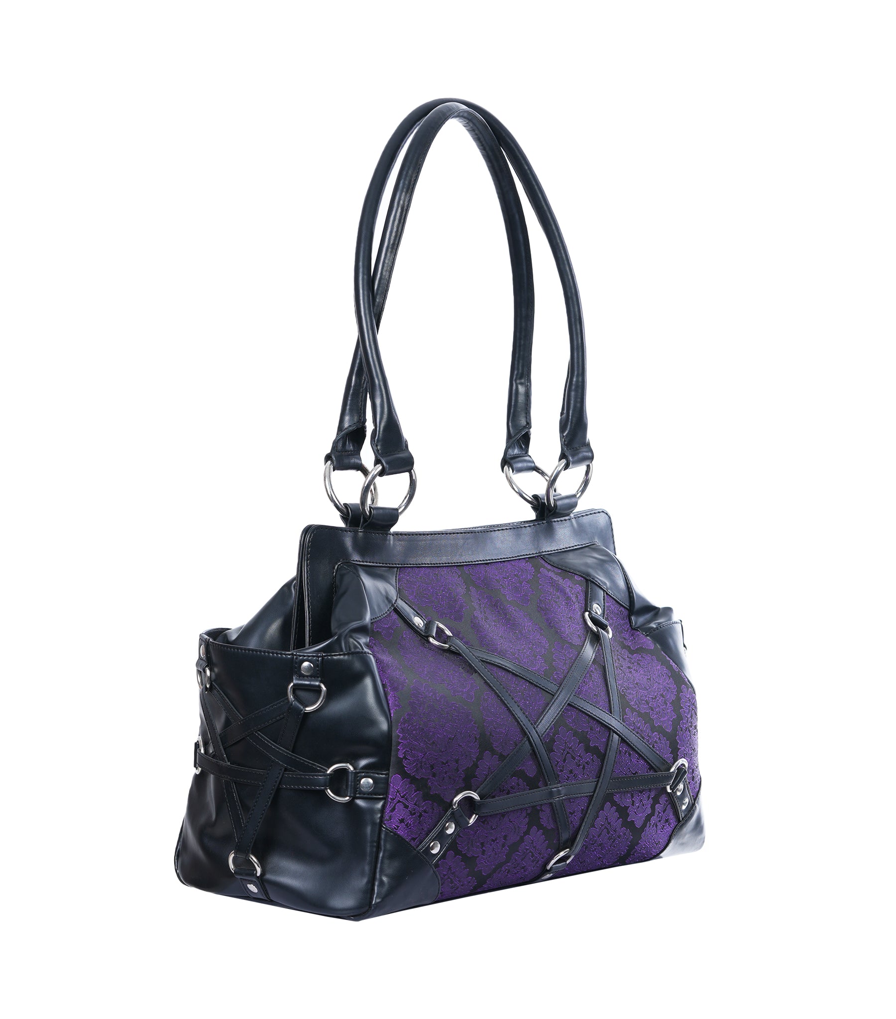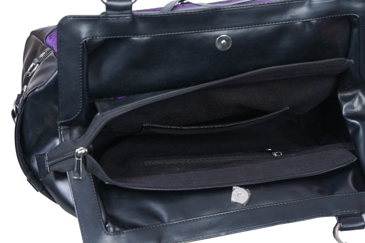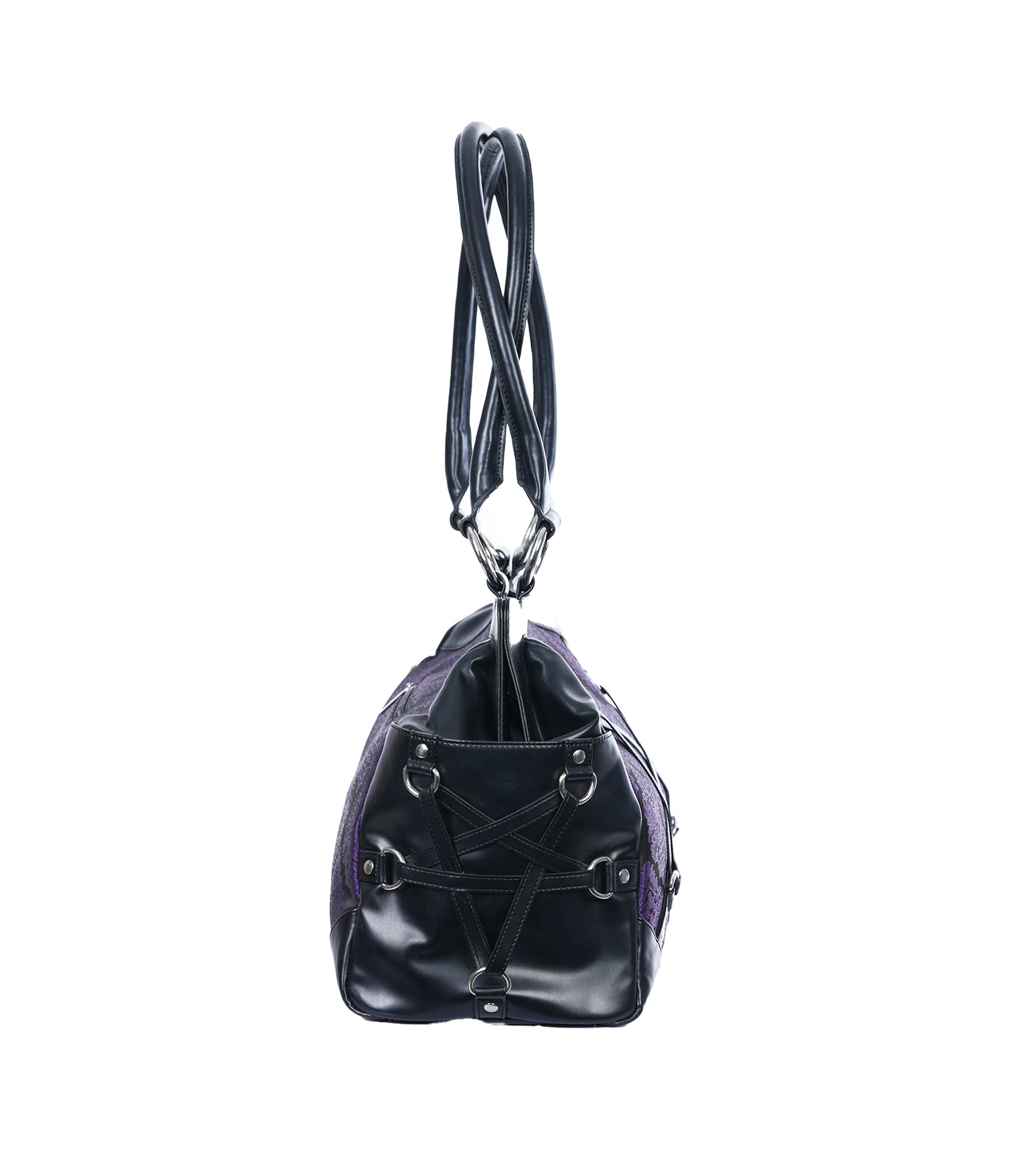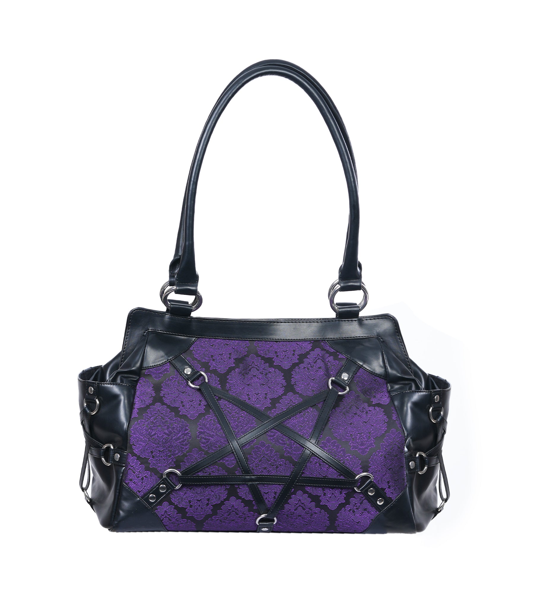 Step into the Mystic Dark Realm with our Dark Pentagram Stand Still Handbag, perfect for adding a touch of gothic Charm to any Purse collection.This handbag features a eye catching pentagram design manufactured from Faux leather, set against a rich purple brocade fabric.This Purse includes one zipper pocket and a spacious main compartment, making it ideal for everyday use.