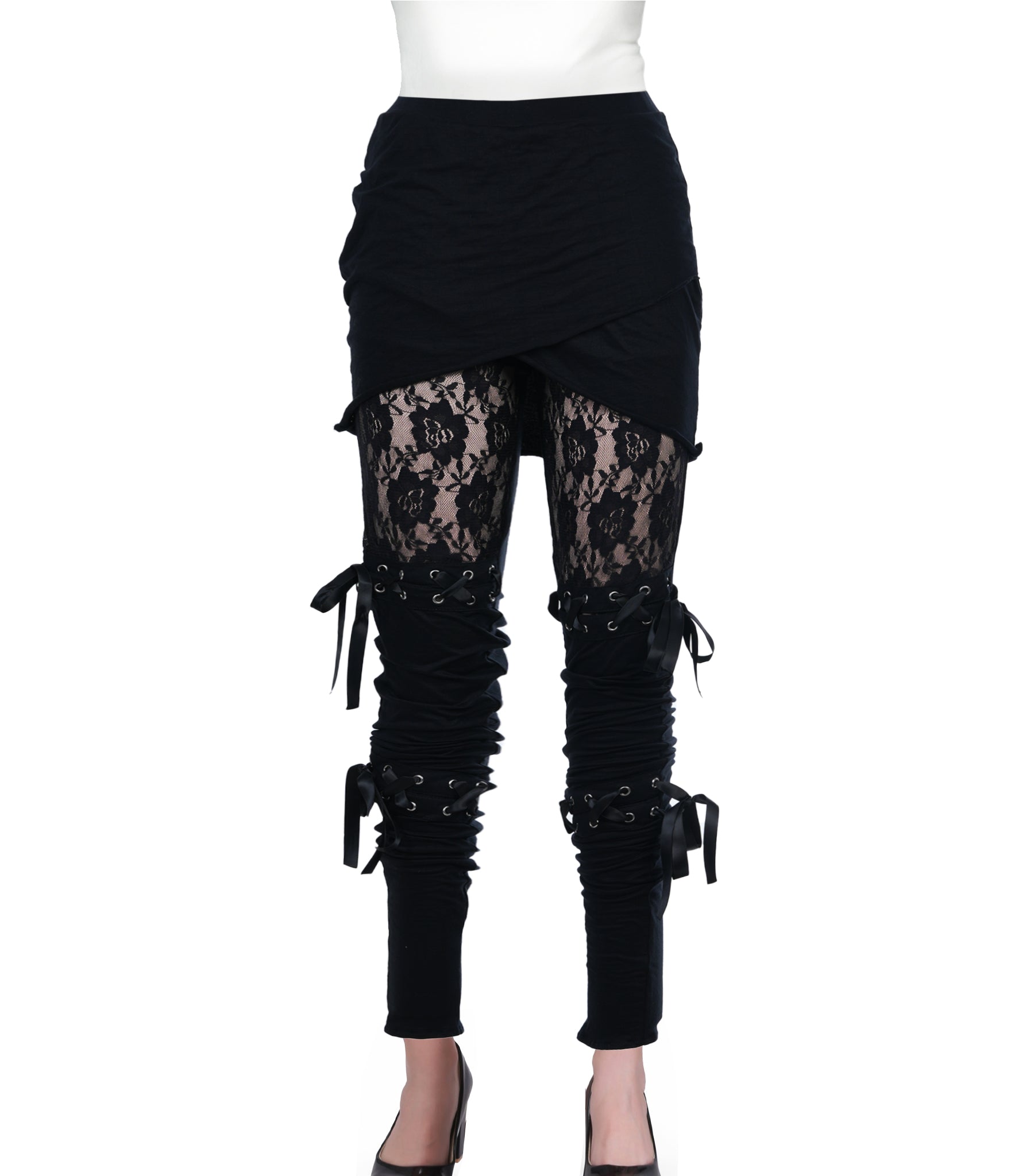 The top layer has a wrap-around skirt look, giving you a nice shape and extra coverage. Underneath, lace panels add a touch of elegance, and crossed satin lace sections give a textured with adjustable look.Made from stretchy, hauzari fabric, these leggings are comfortable and durable. You can wear them with corsets, tunics, or your favorite goth tops. They're great for casual wear or specia steampunkl events.