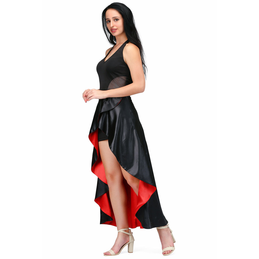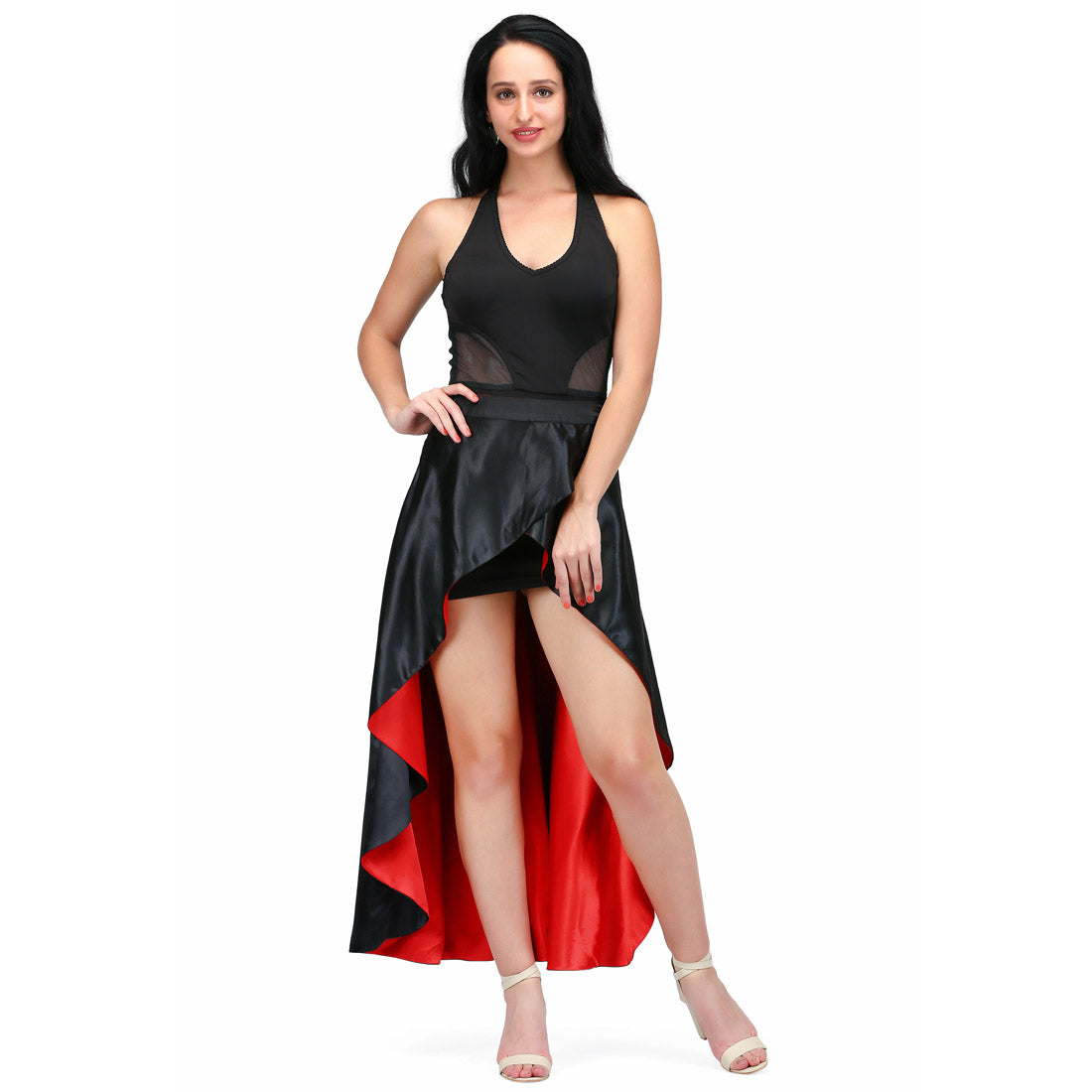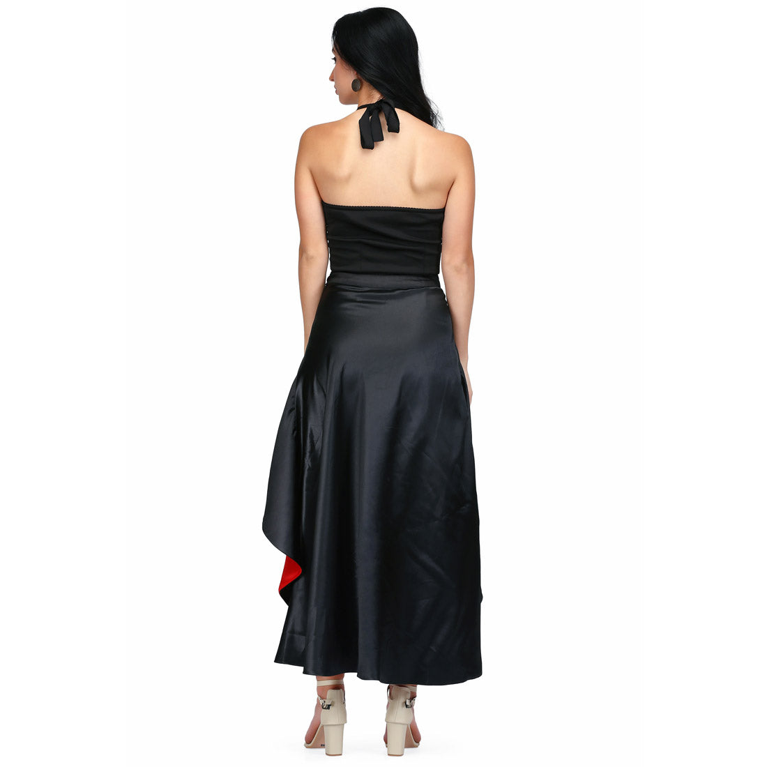long reversible and overlaped skirt in red and black fabric combined with the black fitted dress. Reversible skirt are giving a great look to this garment.