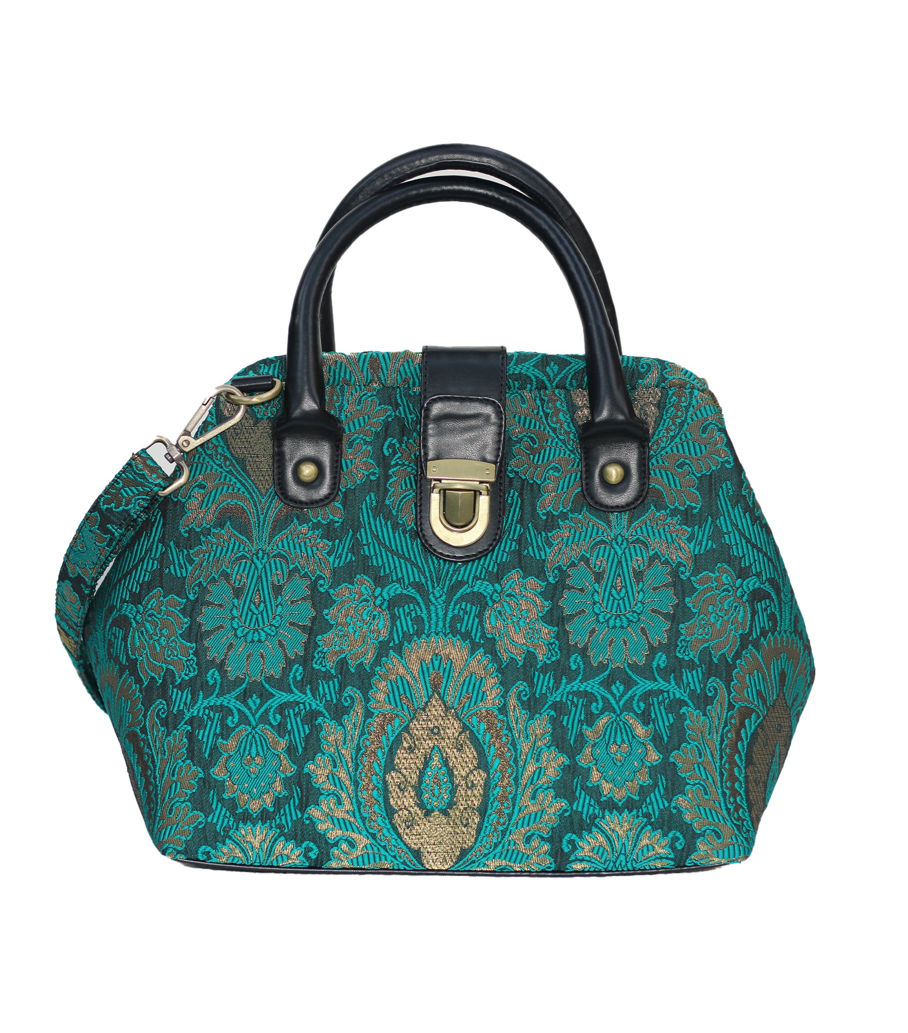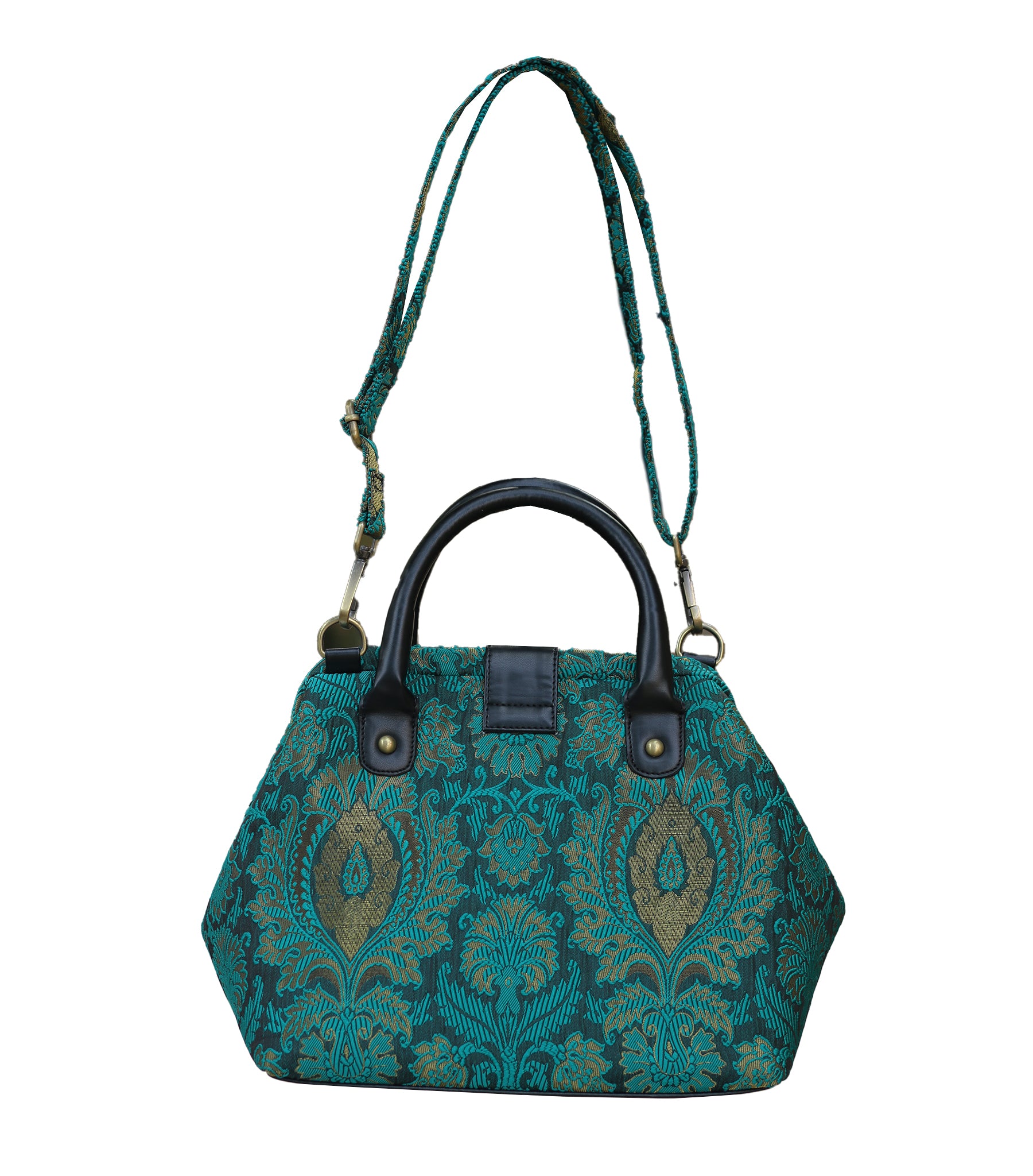 This purse-sized Jacquard bag is really beautiful. It can stand still on its own as it is made of Jacquard fused with Eva Sheet. The handles are made of faux leather. There are 5 bronze studs at the bottom. Every purse comes with a detachable and adjustable shoulder strap 23” in length. The strap is made from the same jacquard as the bag, and fixed with high quality bronze hookers on the two ends.
