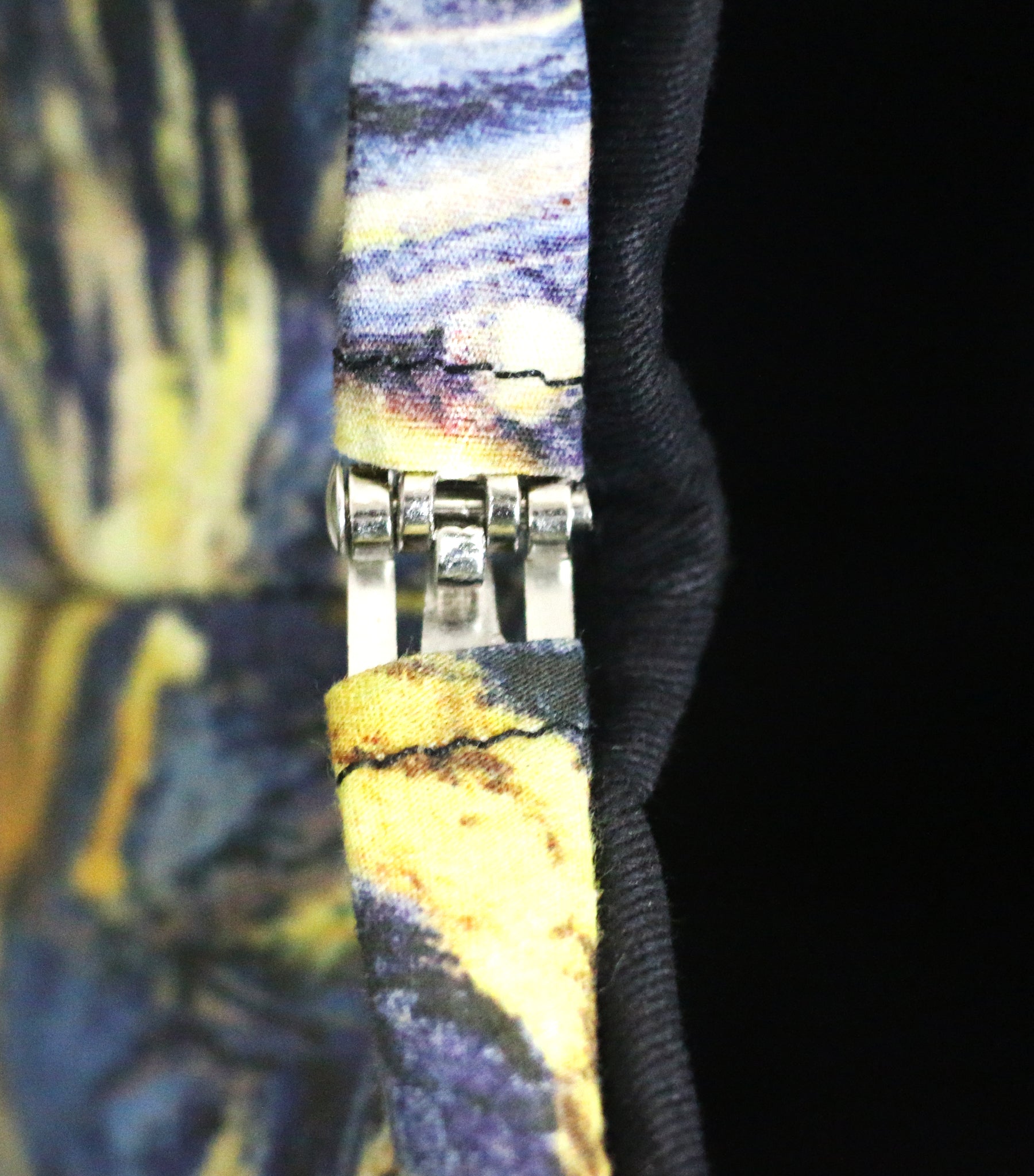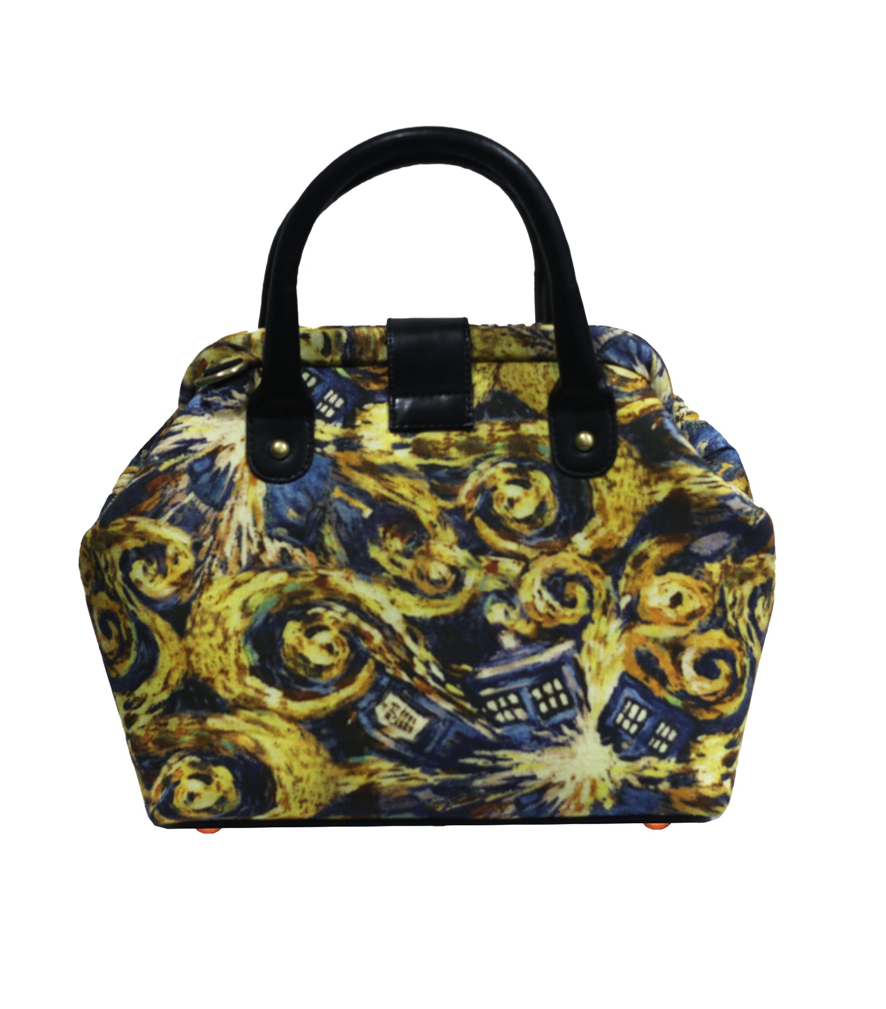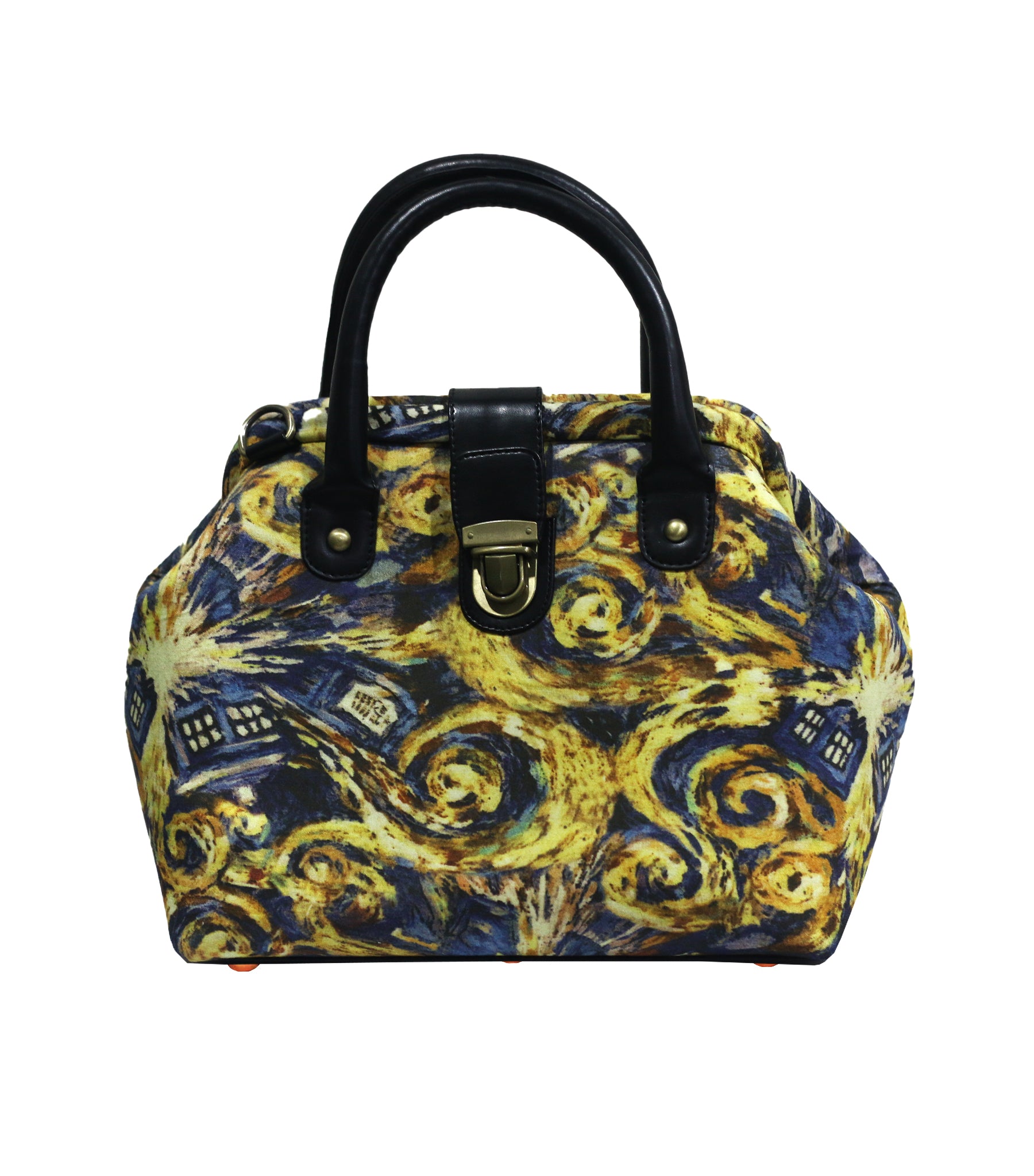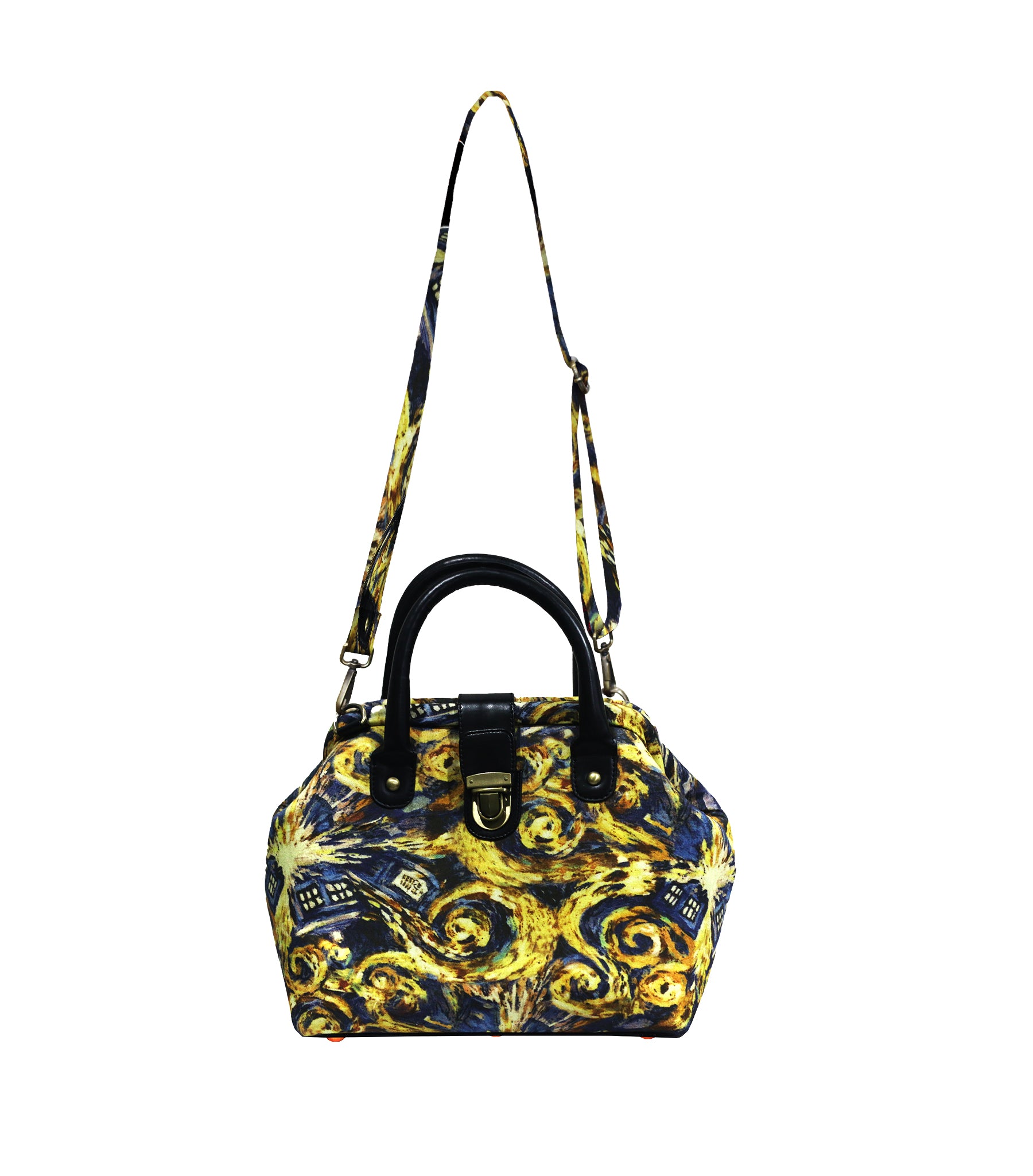 This Vincet van Gogh Inspired Tardis Print fabric Pentagon Shaped Handbag With Sling/crossbody Strap. The handles are made of faux leather. There are 5 bronze studs at the bottom. Every purse comes with a detachable and adjustable shoulder strap 23” in length. The strap is made from the same Flame Printed Fabric as the bag, and fixed with high quality bronze hookers on the two ends.