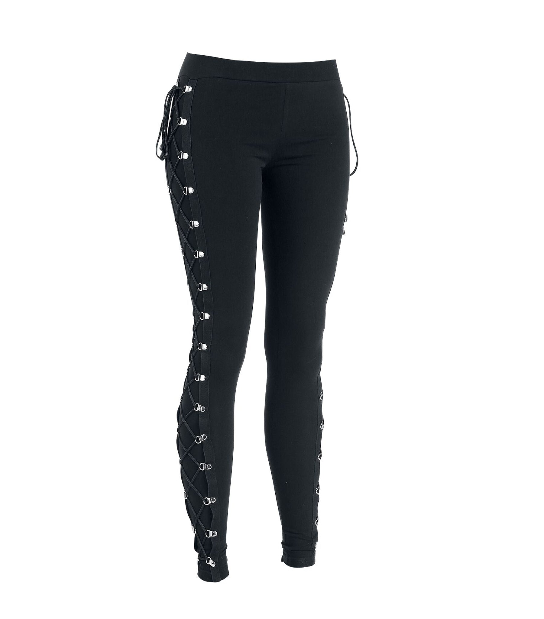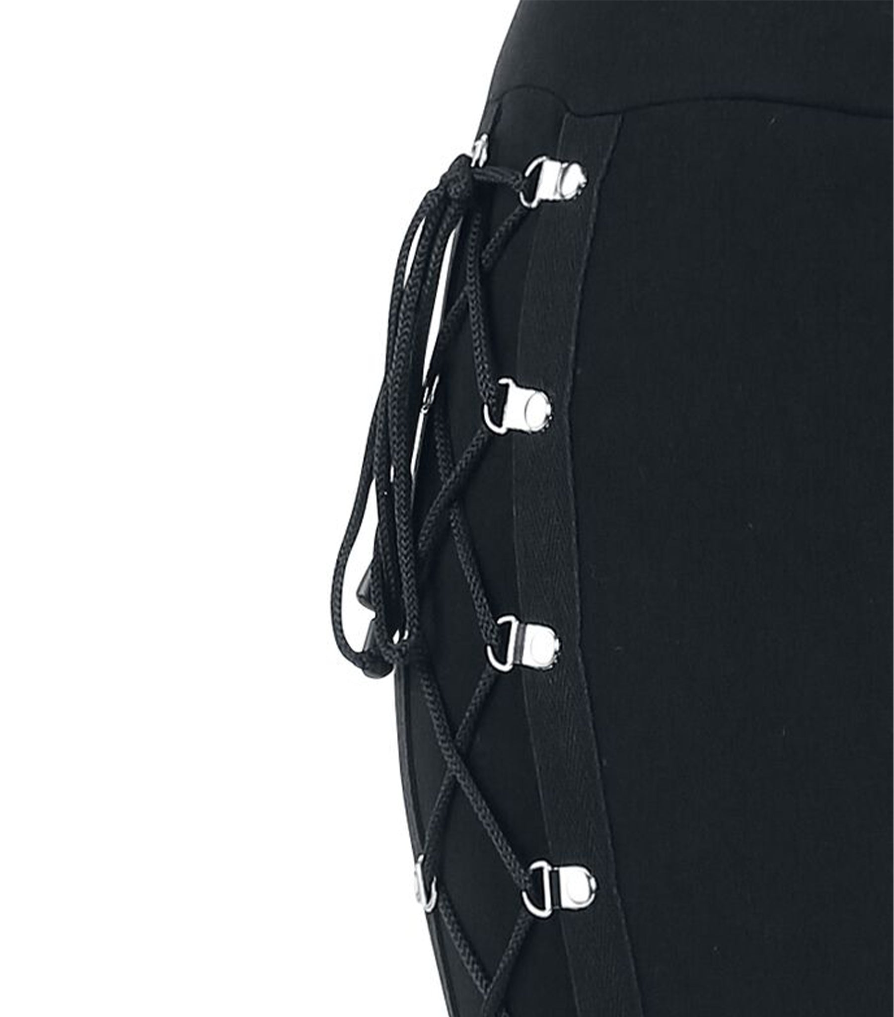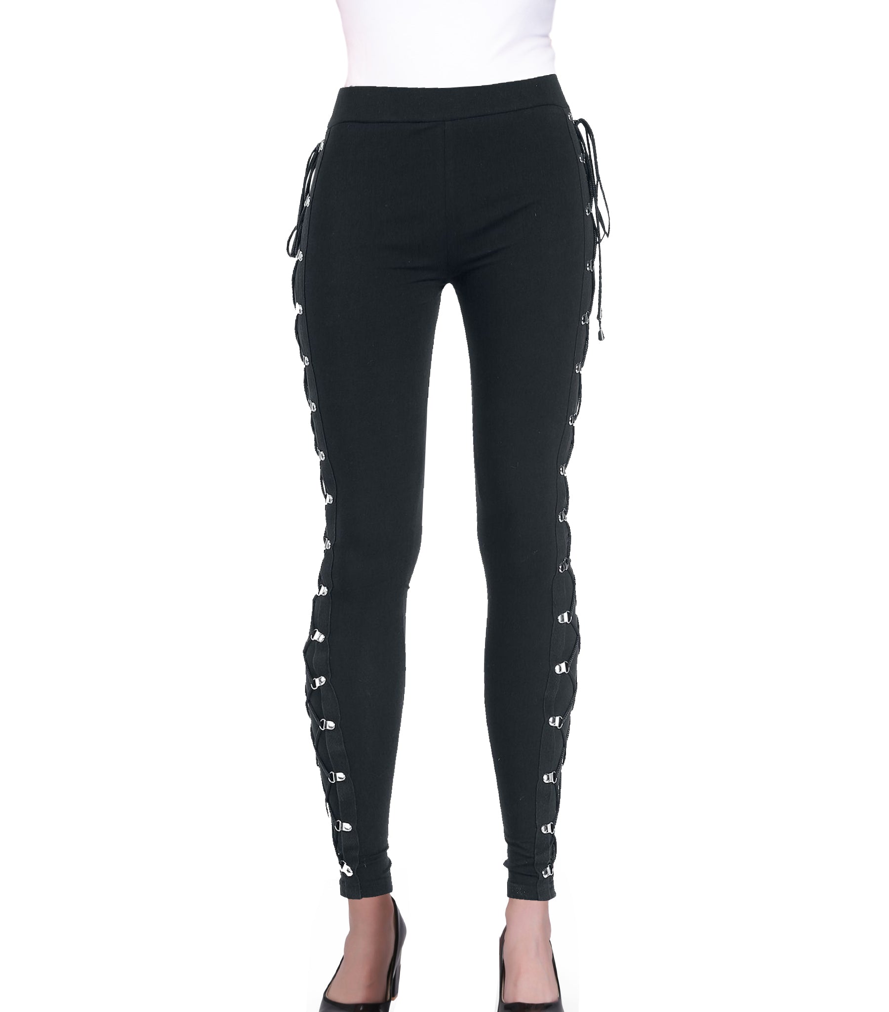 Made from comfortable hosiery fabric, these leggings are high-quality and stylish——a must-have for any retailer. They feature side cross lacing with metal dog hooks, giving them a mysterious and edgy look. With a medium-rise waist and classic black color, they're perfect for any occasions.