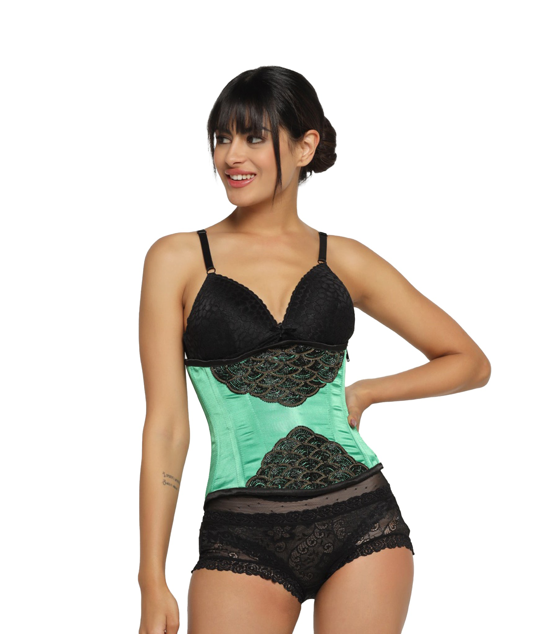 Satin Green Black Embroidered Fish Scale Waist Reducing Underbust Corset
