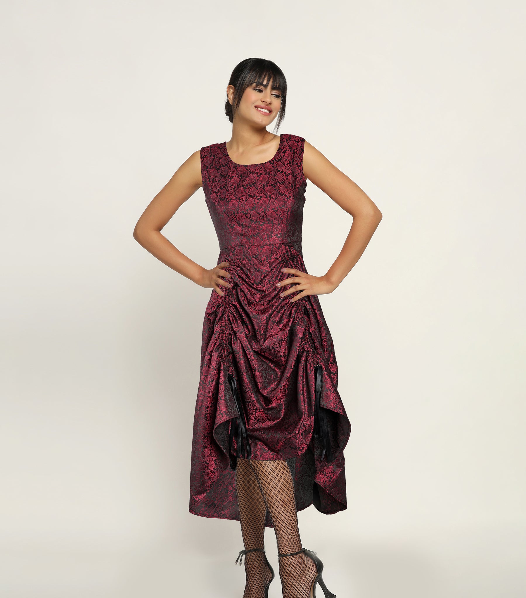 Description: The dress features bloody mary-inspired red brocade fabric, adding a touch of flair to your ensemble. Its adjustable drawstrings on the front allow you to achieve a dramatic high-low look that exudes confidence and style.