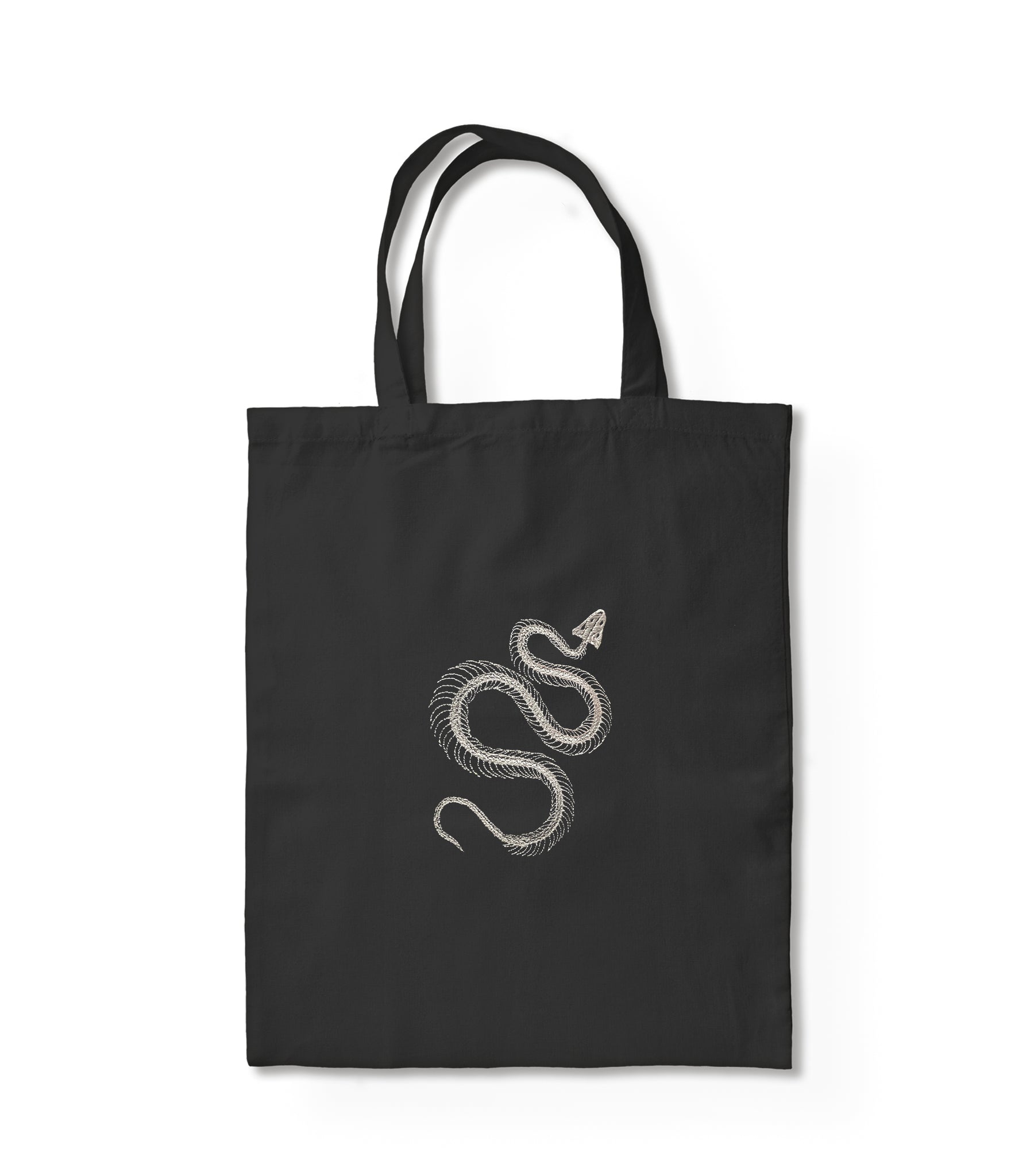 - Intricate snake skeleton design embroidered on durable black fabric