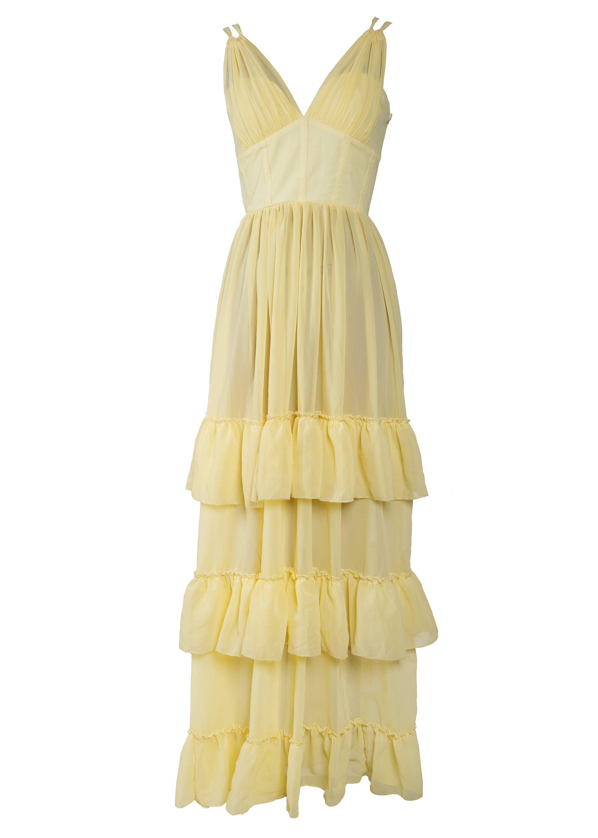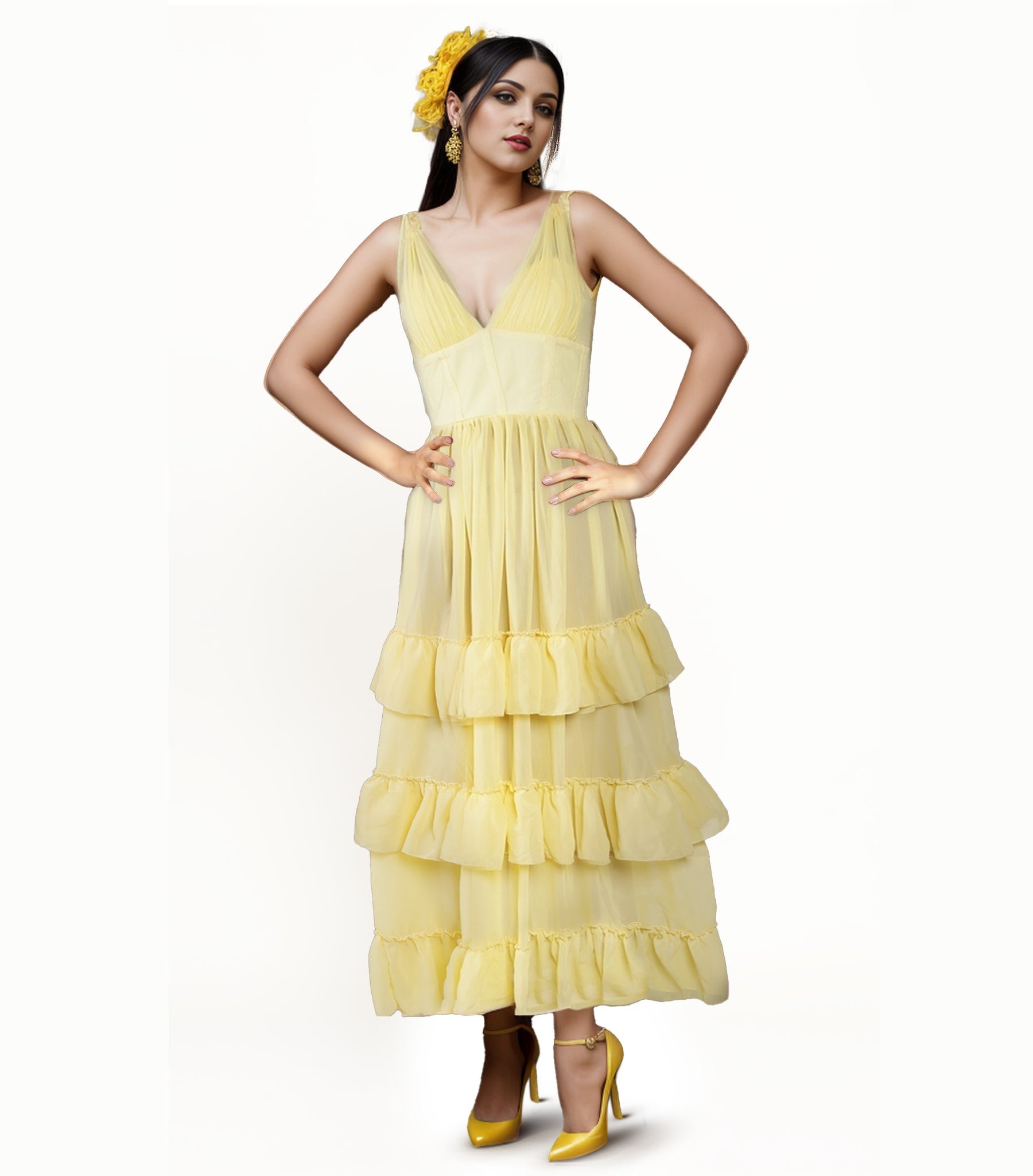 This striking Yellow Tiered Maxi Dress designed to capture attention with its vibrant hue and elegant style. Ideal for various occasions, from casual outings to formal gatherings, this dress flattering V-neckline and a structured bodice that flows into cascading ruffle tiers. It's a versatile piece that combines elegance with comfort, crafted from high-quality chiffon for durability and all-day wear.